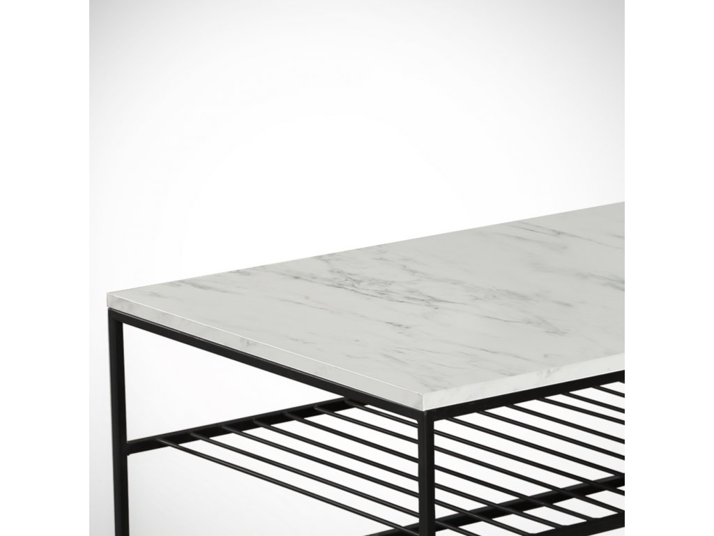 ETNA je dvoupatrový konferenční stolek, který nabízí horní odkládací desku v dekoru bílého mramoru, pod kterou je umístěn ještě jakýsi rošt z kovových drátů.