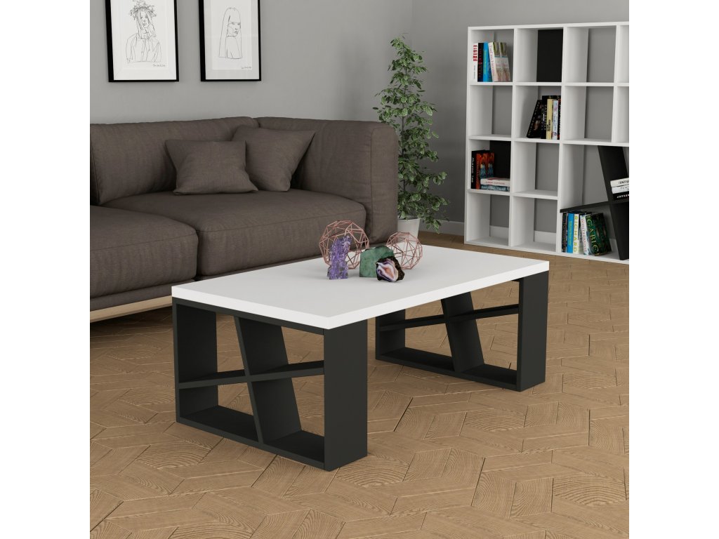 HONEY je designovým konferenčním stolkem složeným z velké bílé desky a robustně vyhlížejících antracitových nohou, jejichž příčky můžete využít i jako drobné poličky.