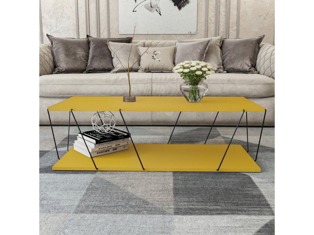 Konferenční stolek LABRANDA je vyrobený ze dvou žlutých desek, které jsou rafinovaně propojené černými kovovými výztužemi.