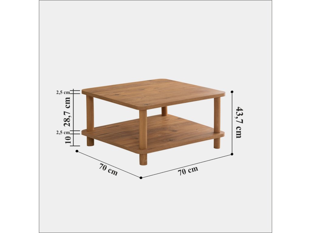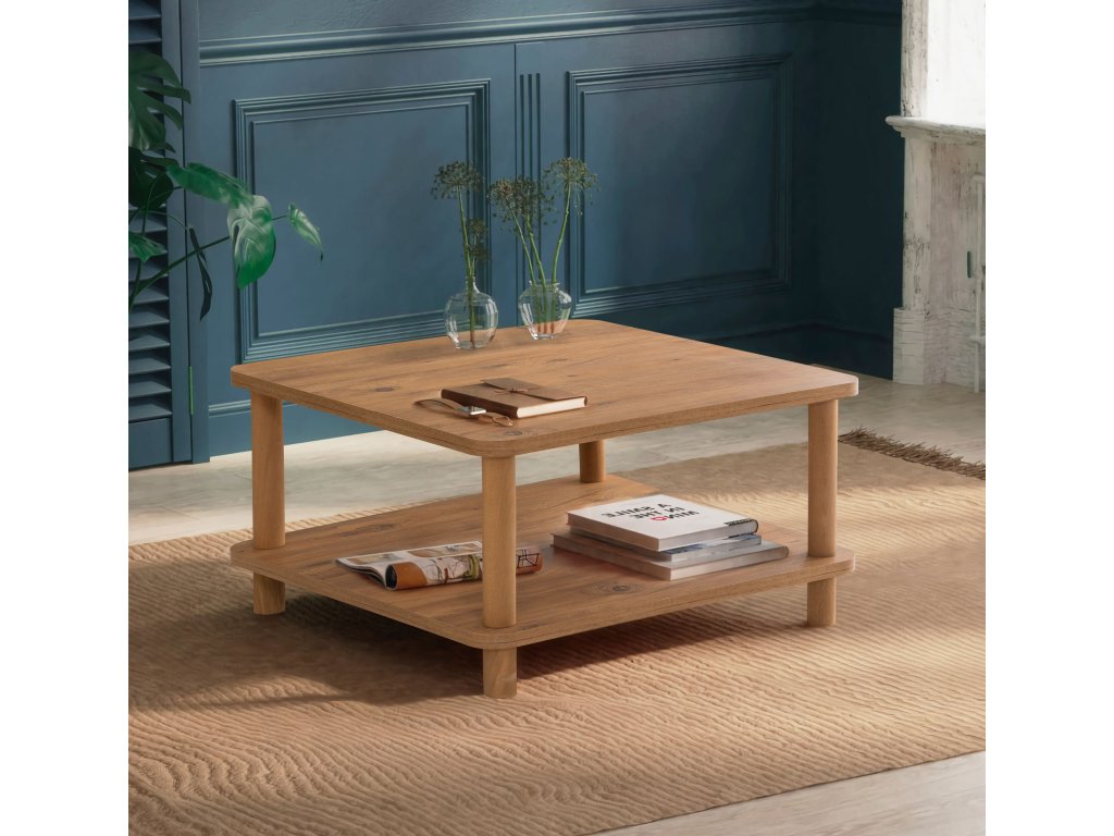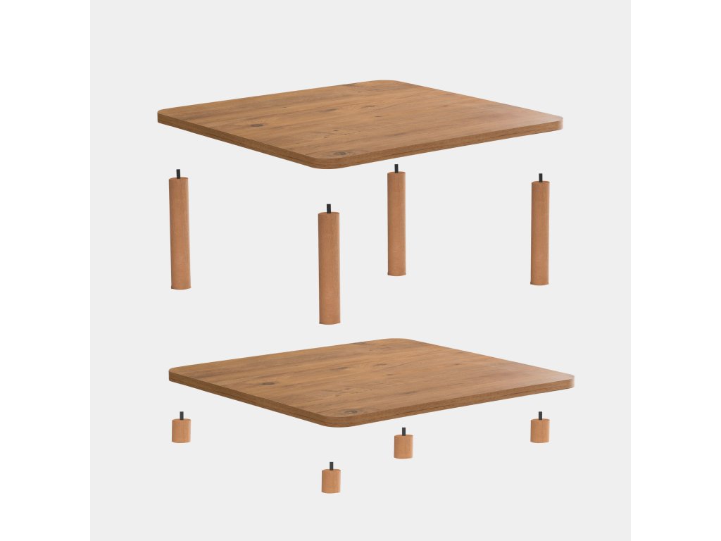 Stolek stojí na nízkých nožičkách, přírodní provedení se bude dobře kombinovat.