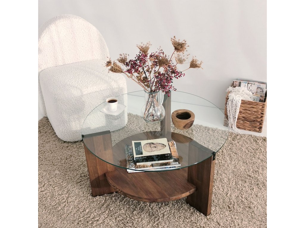 Je vyroben z masivního dřeva v dekoru ořech a z tvrzeného čirého skla.