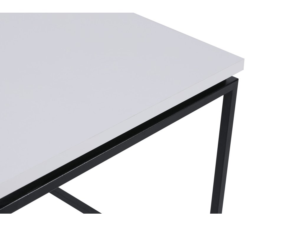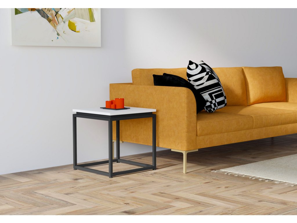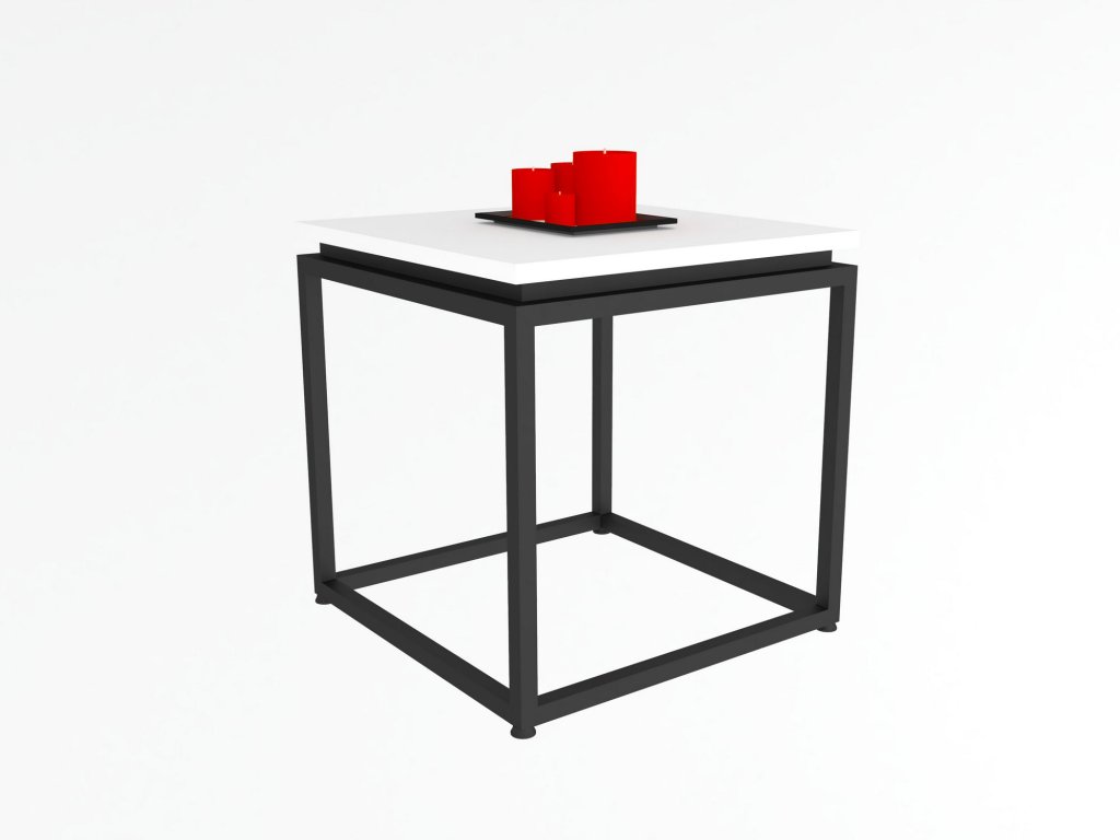 Víceúčelový konferenční stolek NERGIS ve tvaru krychle je složený z bílé desky usazené v robustní černé kovové konstrukci.