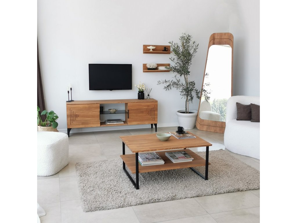 Je vyrobený z černých kovových rámů a z 18 mm silných desek pokrytých 100 % melaminem v dekoru dub.