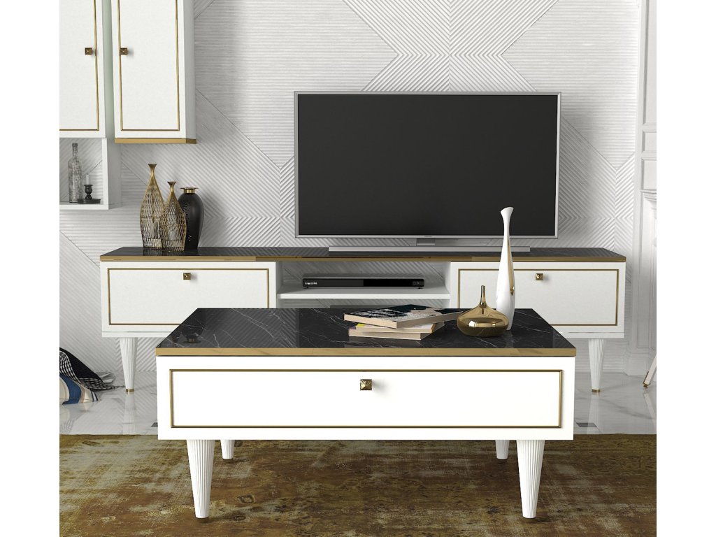 Je vyroben z 18mm silných desek pokrytých 100% melaminem v bílé barvě a dekoru černého mramoru s doplňkovou zlatou lištou.