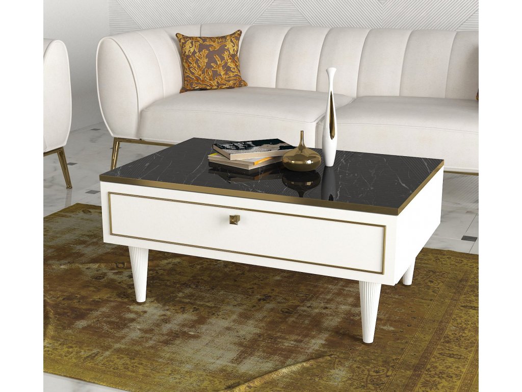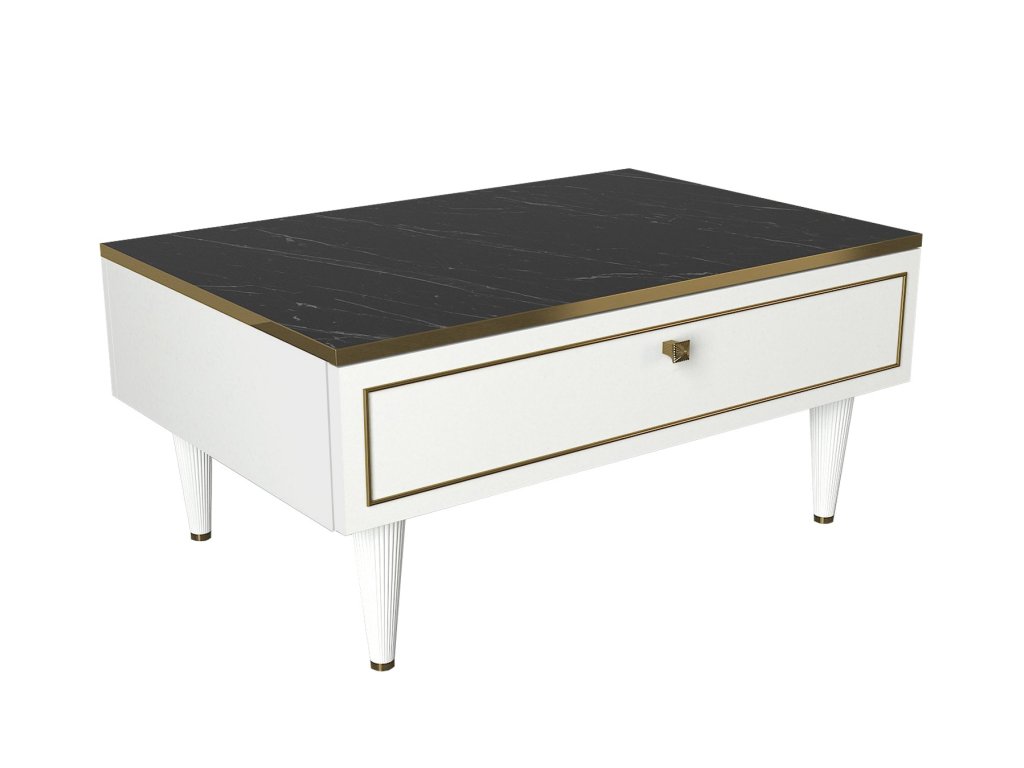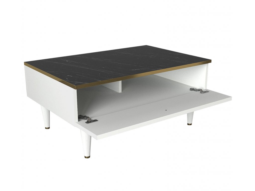 Stolek upoutává pozornost kontrastem barev černého mramoru a bílého těla i nohou, které doplňuje ještě zásuvka s výklopnými dvířky.