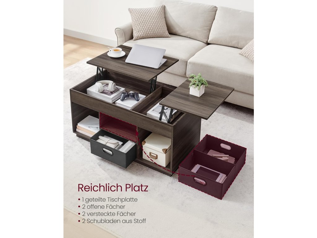 Konferenční stolek má dvousměrný zvedací mechanismus, který otevírá dvě nezávislé plochy. Větší část lze namontovat tak, že ji lze posunout dopředu nebo dozadu.