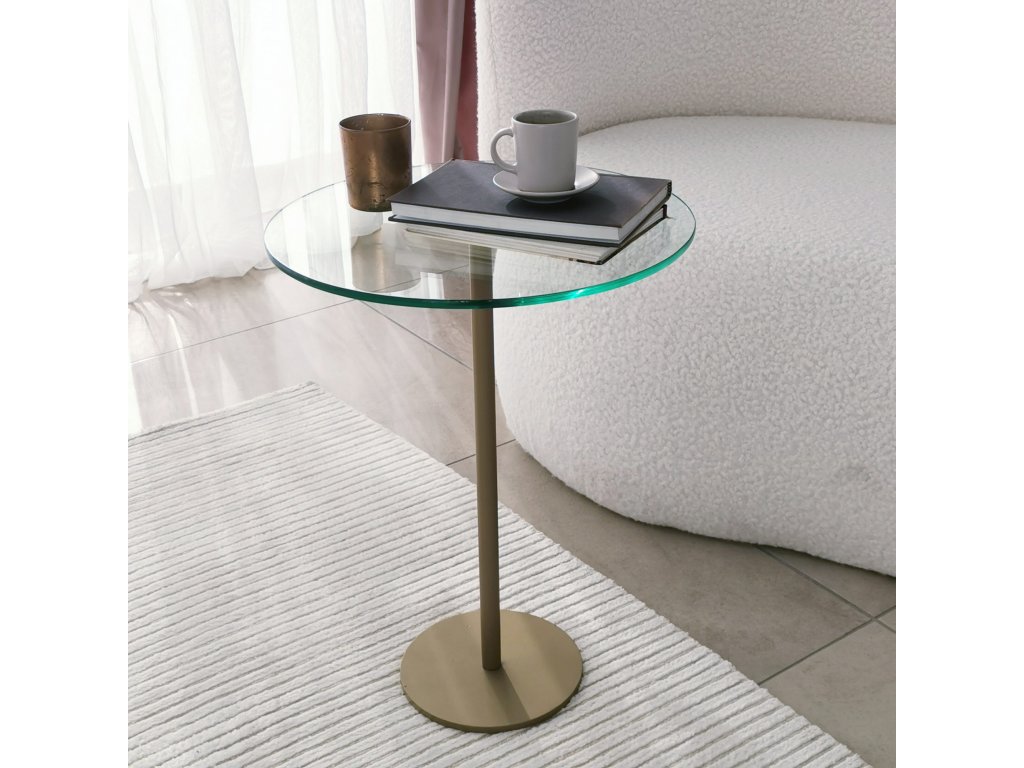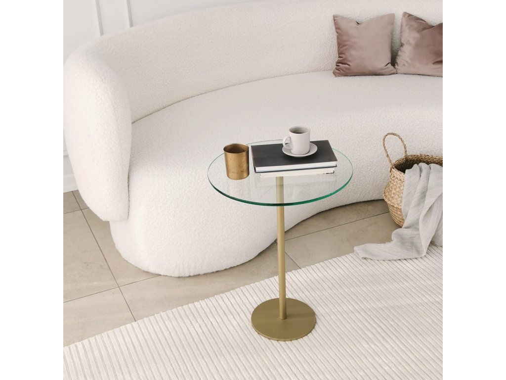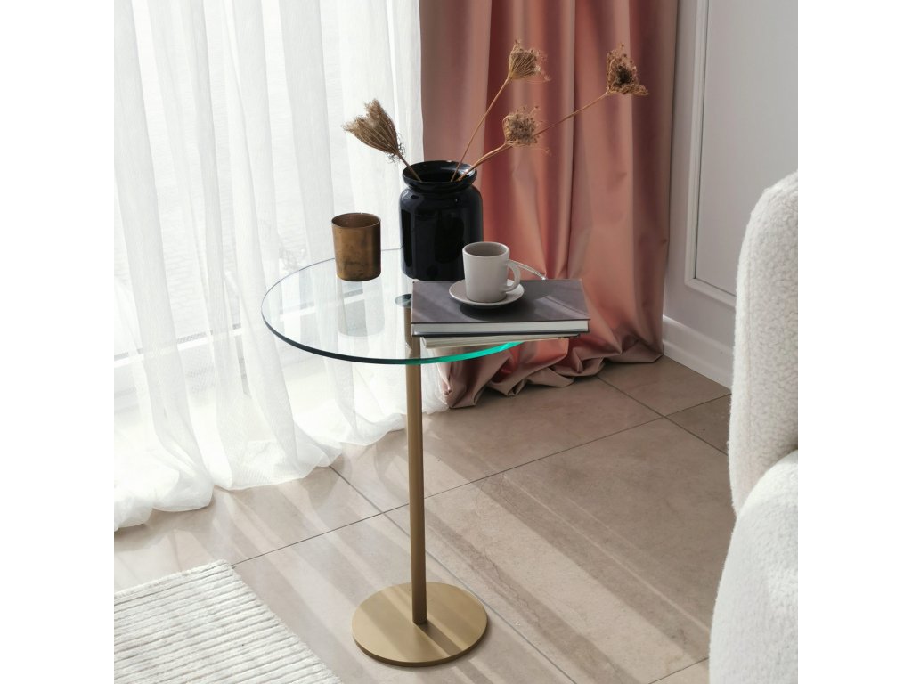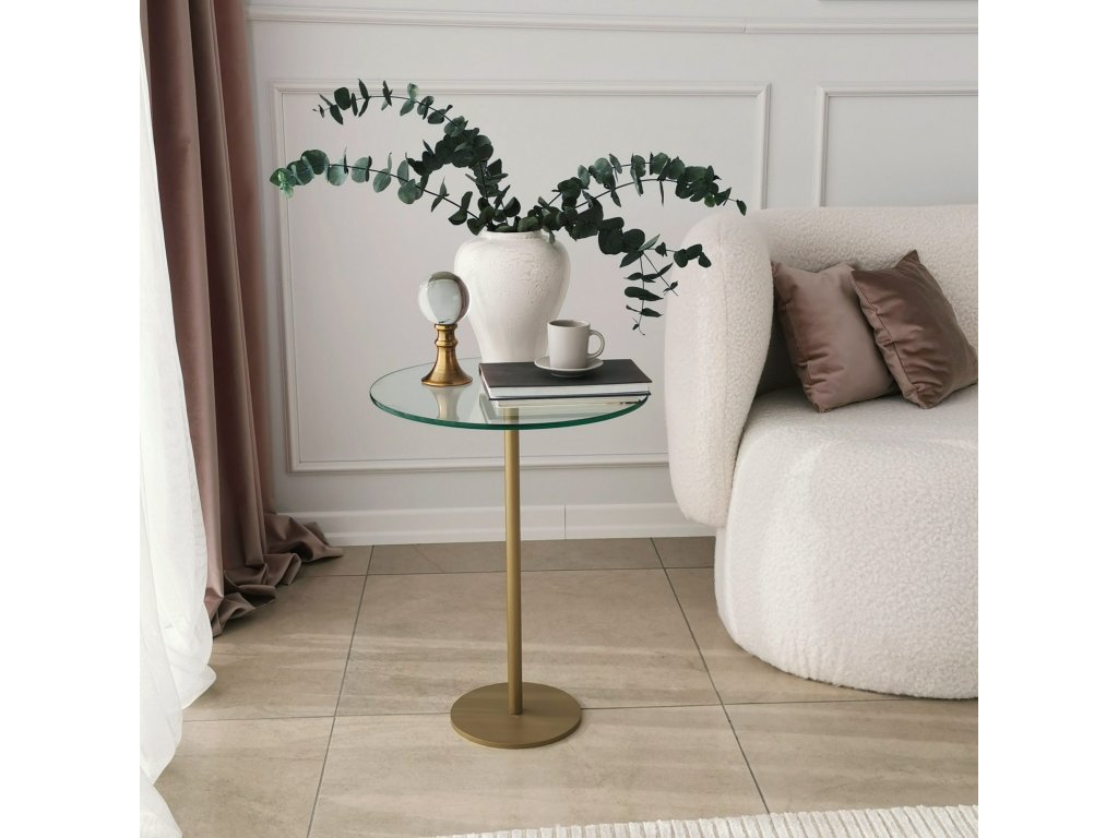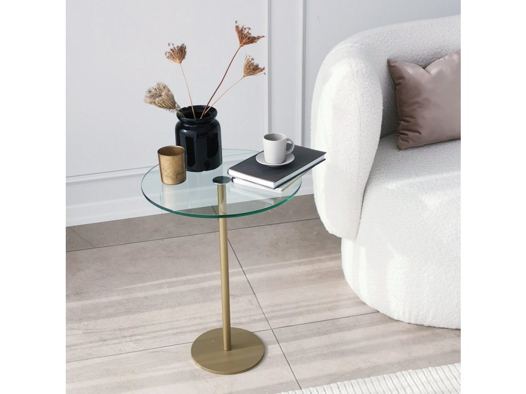 Je vyrobený z antibakteriální nerezové kovové nohy zlaté barvy a z čirého tvrzeného skla.