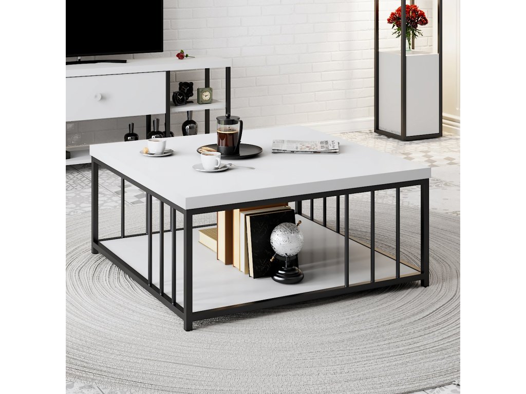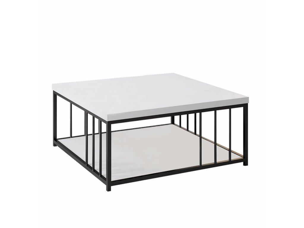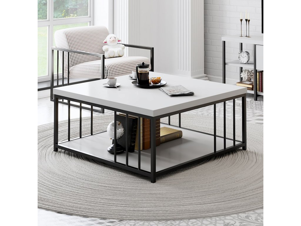Dvoupatrový konferenční stolek ZENN odpovídá zenovému klidnému designu, kdy jsou dvě bílé čtvercové desky usazeny a vzájemně propojeny černou kovovou konstrukcí s tyčemi tvořícími bočnice.