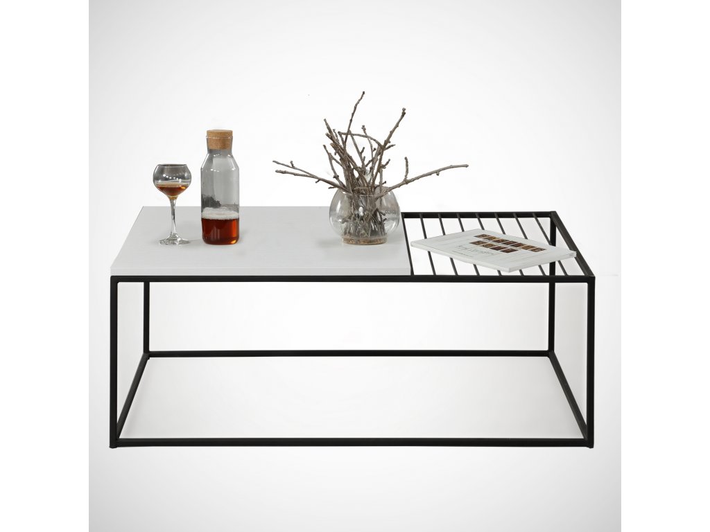 Víceúčelový konferenční stolek ZINUS je složený z bílé desky usazené v černé kovové konstrukci ve tvaru kvádru.