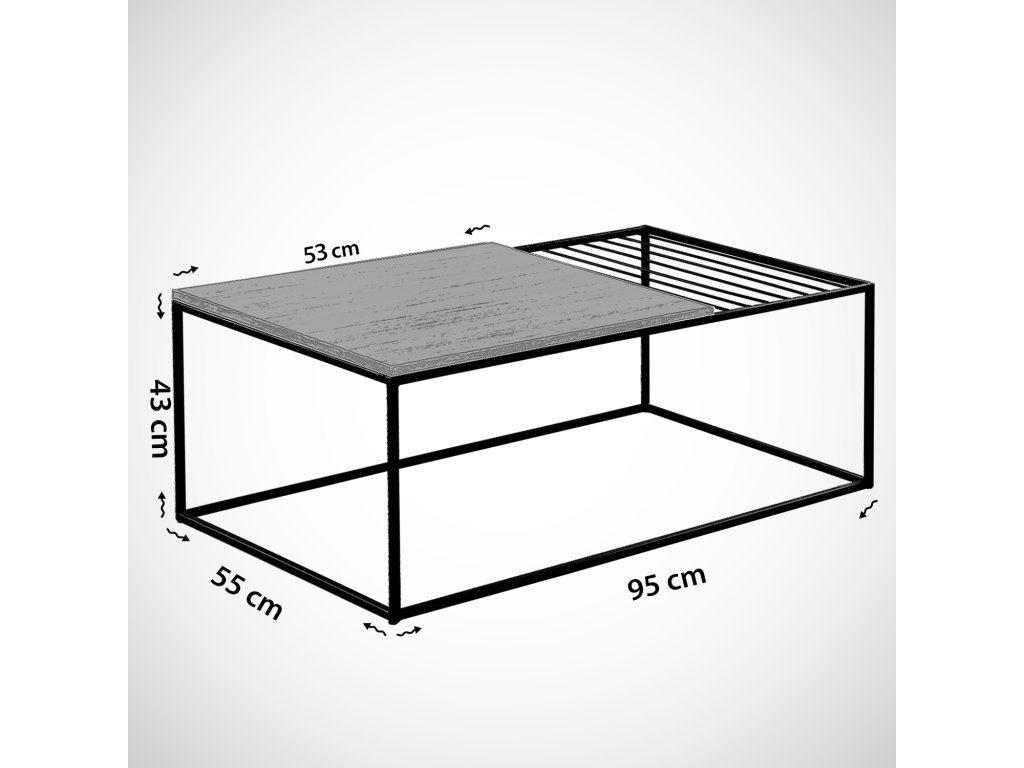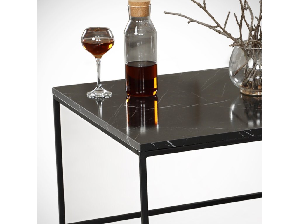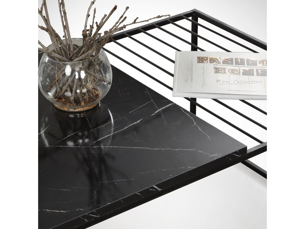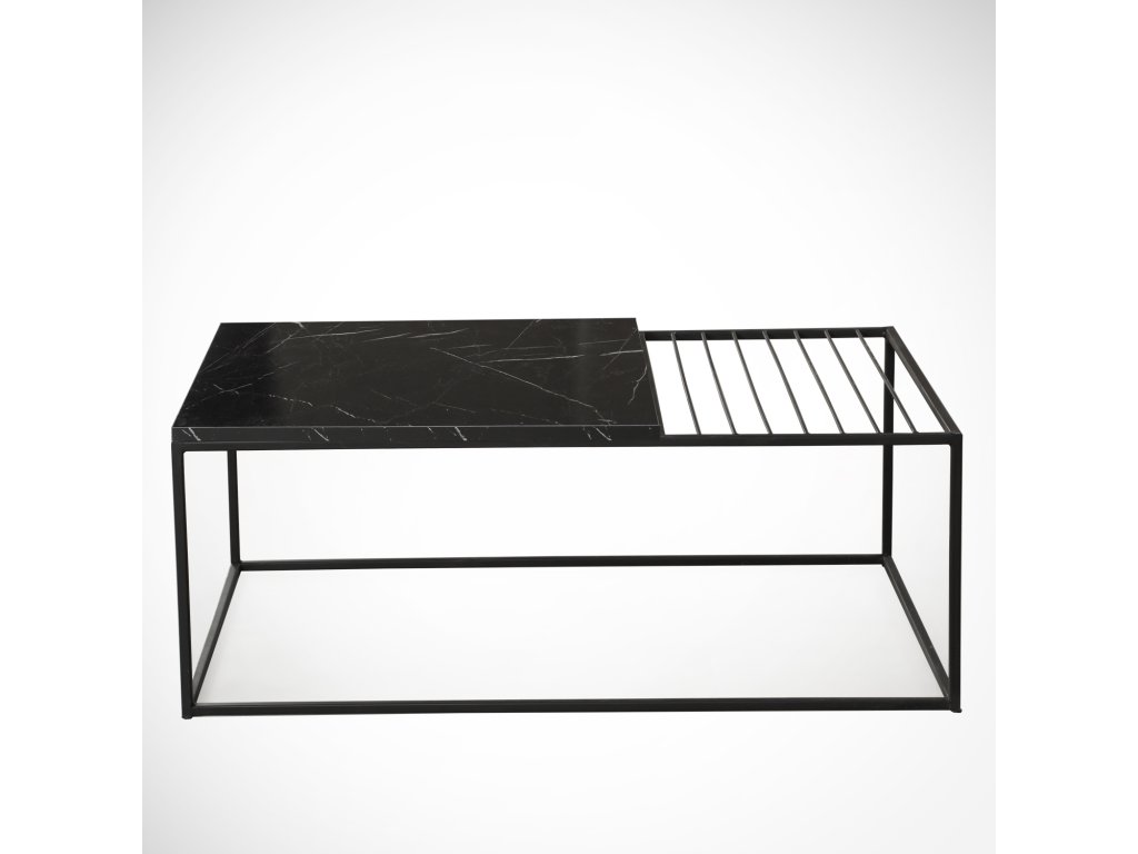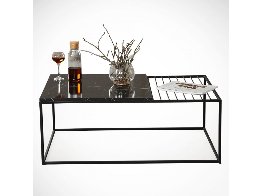 ZINUS je konferenční stolek, který nabízí odkládací prostor tvořený částečně deskou s dekorem černého mramoru a částečně černým kovovým roštem.
