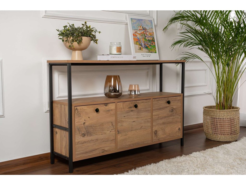 Přidejte do svého domova nádech industriálního šiku s tímto univerzálním konzolovým stolkem, ideálním pro vystavení vašich oblíbených dekorací nebo uložení každodenních nezbytností. Elektrostatické práškové lakování a PVC hrany zajišťují dlouhotrvající povrch, který odolá každodennímu používání.