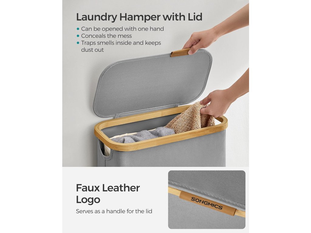 Koš na prádlo má víko, které chrání před prachem a také chrání soukromí tím, že skrývá nepořádek. Logo z PU slouží jako rukojeť pro snadné otevírání a dodává mu stylový vzhled.