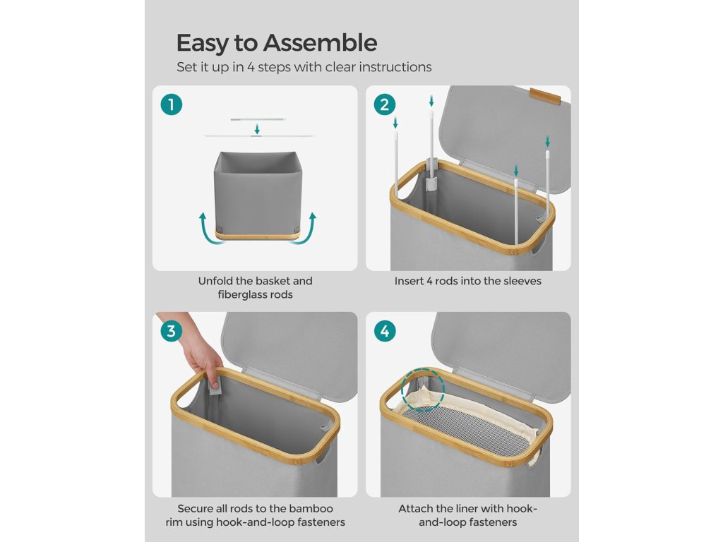 Díky jasným pokynům a bez nutnosti použití nářadí můžete tento koš na prádlo snadno sestavit za pouhých 5 minut.