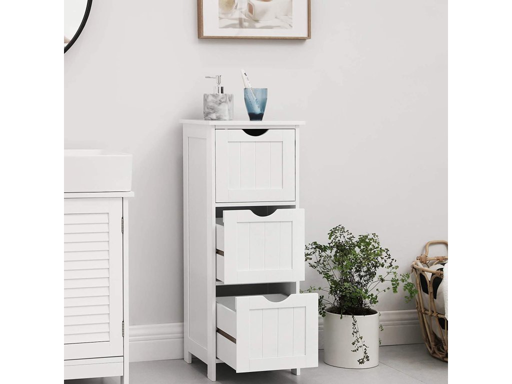 Tato úzká zásuvková skříňka lehce zapadne do každé koupelny. Skříňka disponuje třemi zásuvkami, do kterých lze uschovat ručníky, kosmetiku či jiné potřebné věci.