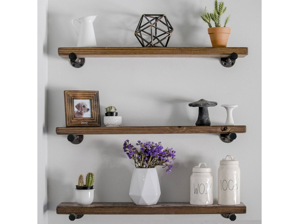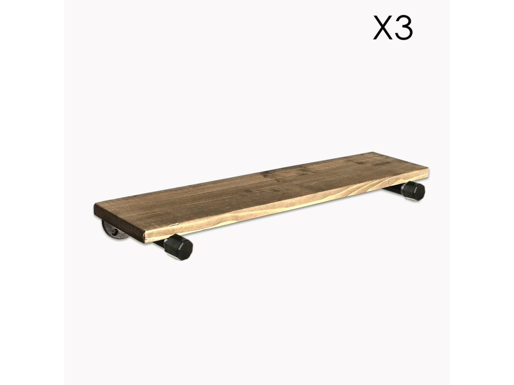 Sada tří poliček vyrobených z masivního smrkového dřeva. Konzole imitují vodovodní potrubí a dodávají tak originální vzhled.