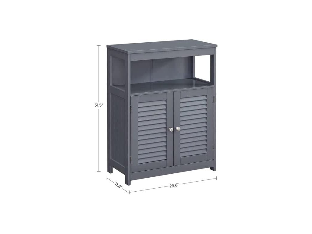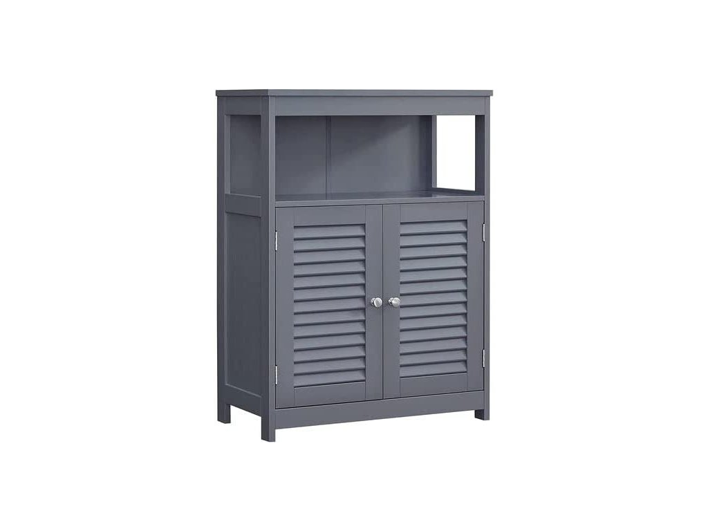 Skříňka vyrobená v šedé barvě se stříbrnými úchyty na dvířkách a vyvýšeným regálem úložné prostory, do kterých uložíte vše, co je v koupelně třeba.