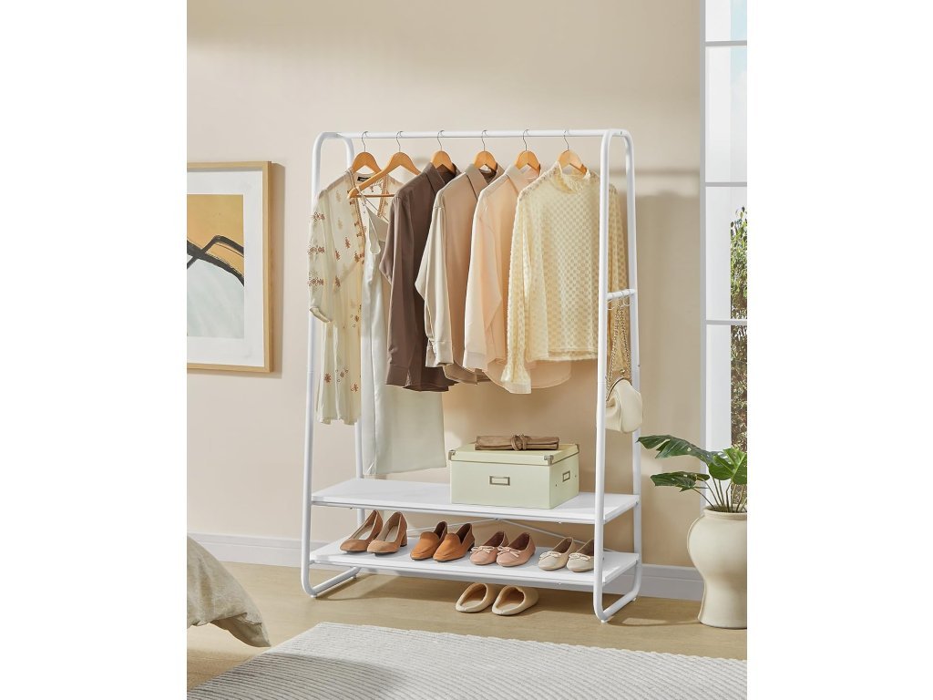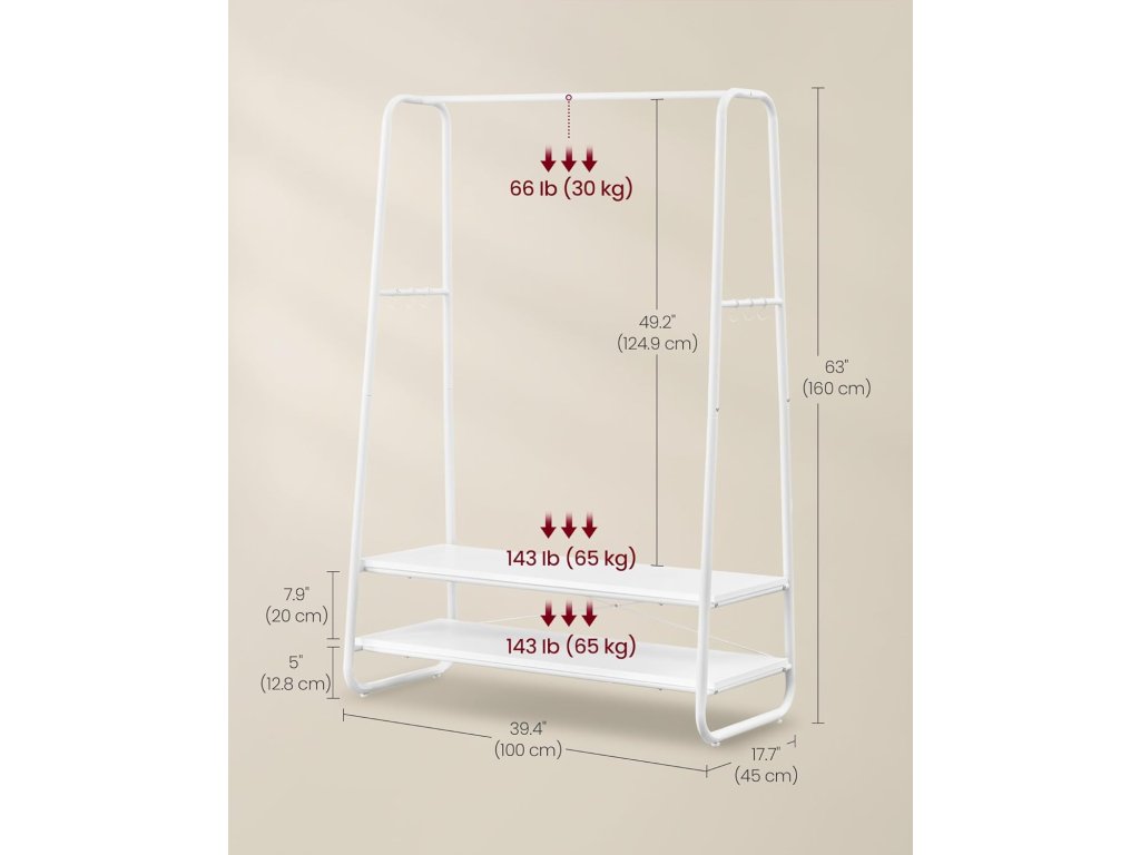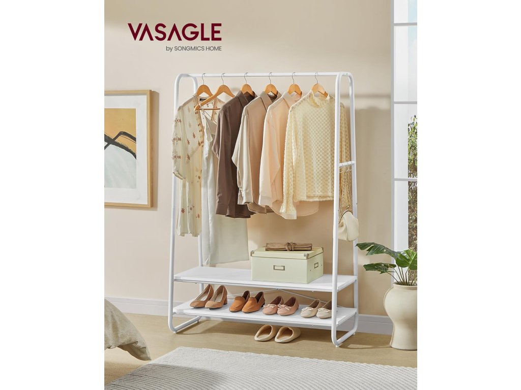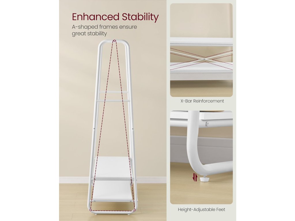 Stojan na oblečení je vyroben z kvalitní dřevotřísky, která je odolná. Ocelová konstrukce ve tvaru písmene A a dvouúrovňové police přispívají ke stabilitě bez kývání a pomáhají mu udržet celkovou nosnost až 190 kg.