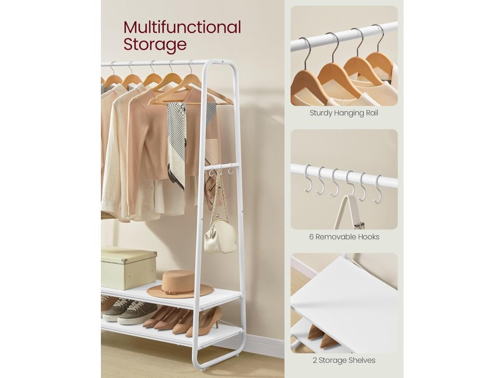 Věšák na oblečení se závěsnou lištou, 2 policemi a 6 bočními háčky ve tvaru písmene S usnadňuje ukládání oblečení, bot, tašek a doplňků, abyste měli v životě pořádek.