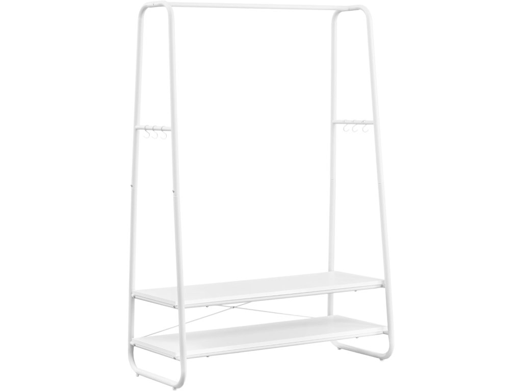Tento věšák na oděvy o rozměrech 45 x 100 x 160 cm (D x Š x V) nabízí otevřený úložný prostor se závěsnou lištou, 6 háčky ve tvaru S na obou stranách a dvěma spodními policemi pro každodenní použití.