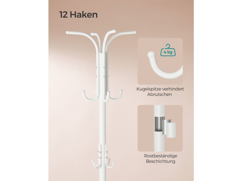 Díky 4 robustním nohám a nízkému, stabilnímu těžišti můžete na tento věšák bez obav pověsit těžší kabáty a tašky na 12 robustních háčků (každý háček unese až 4 kg), které zajistí, že vaše věci zůstanou bezpečně na svém místě.