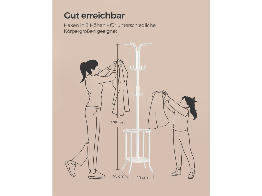 Tento věšák na kabáty zahrnuje stojan na deštníky s vyříznutou částí vhodnou pro dlouhé i skládací deštníky a odkapávací misku, která chrání vaše podlahy před dešťovou vodou.