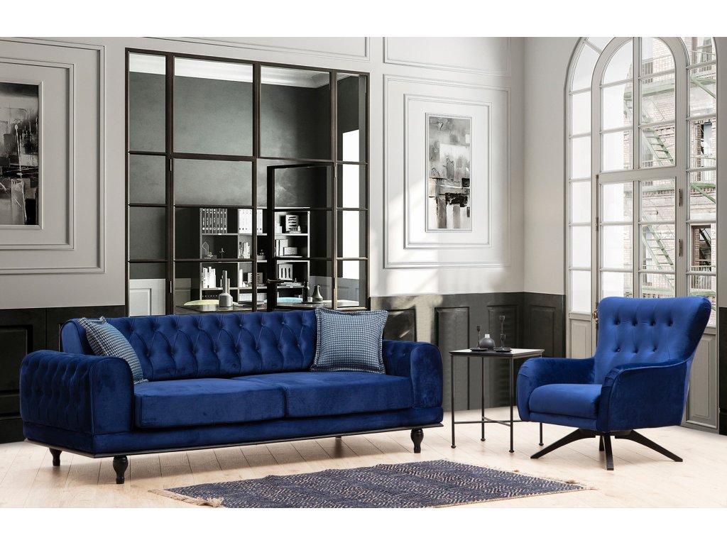 Moderní modré křeslo ARREDO V2 je bohatě polstrované a je vyrobené v chesterfieldovém stylu a možná se proto bude hodit do domu nebo bytu právě Vám.