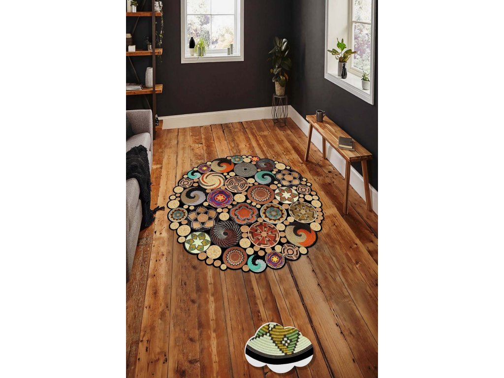 Kulatý koberec (130 cm) HMNT971 černý – mandaly a ornamenty