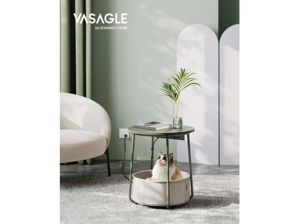 Kulatý odkládací stolek s textilním košem a zásuvkou zelený