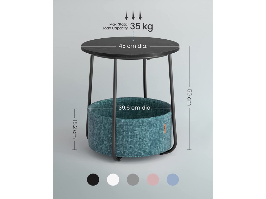 Odkládací stolek o rozměrech 45 x 50 cm (průměr x výška) s košem o rozměrech 39,6 x 18,2 cm (průměr x výška) se hodí do malých prostor. Jako boční stolek v obývacím pokoji nebo jako noční stolek v ložnici není objemný, ale nabízí dostatek úložného prostoru pro vaše věci.