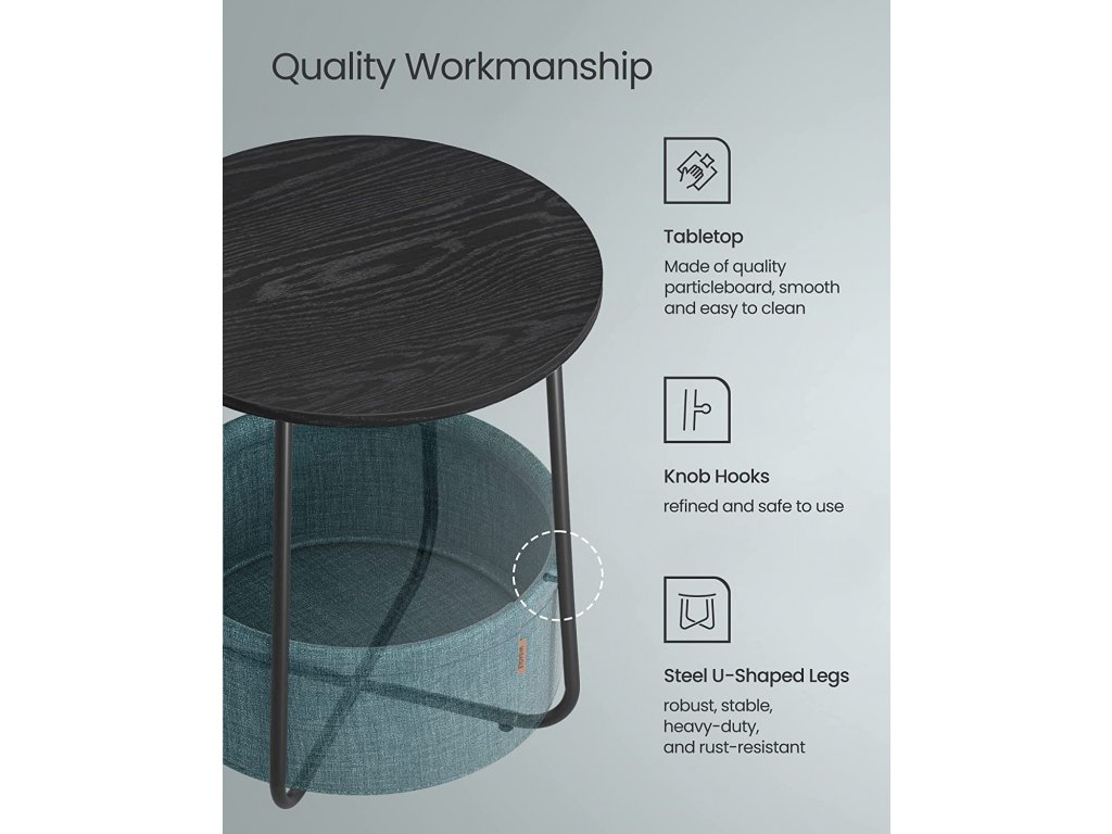 Jednoduchý černý kulatý konferenční stolek se strukturou dřeva a tmavě tyrkysovým košem dodá vašemu obývacímu pokoji nebo ložnici další nádech stylu a snadno se kombinuje s různými styly nábytku.