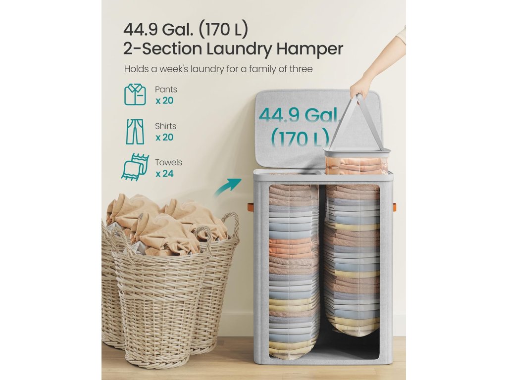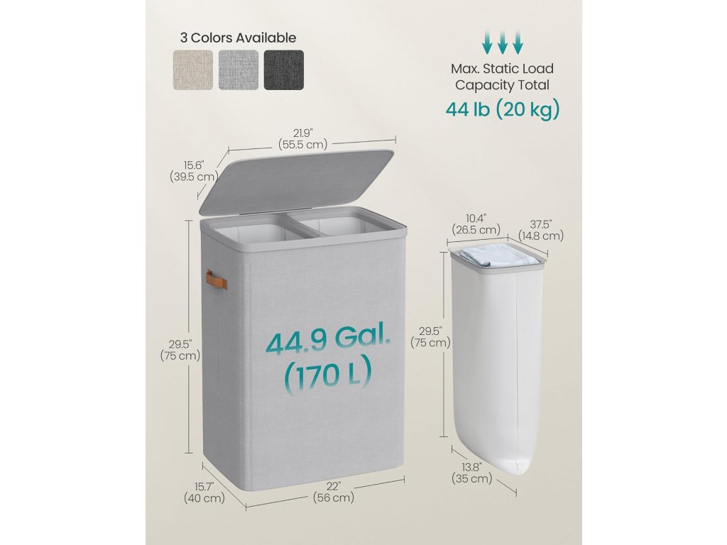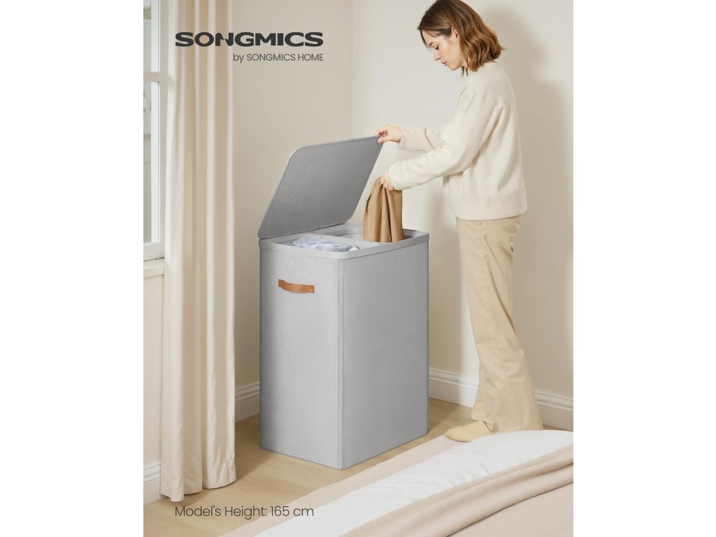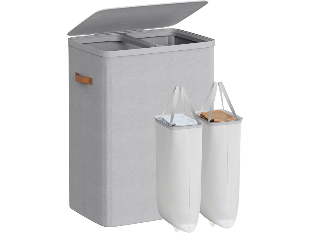 Koš na prádlo se 2 přihrádkami o rozměrech 56 x 40 x 75 cm pojme až 170 l prádla, což je ideální pro třídění týdenního prádla tříčlenné rodiny.