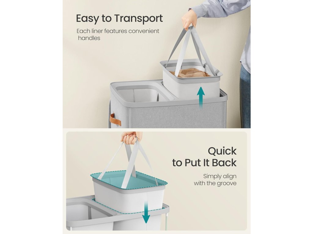 Tělo koše a vnitřní vaky jsou opatřeny držadly, abyste mohli prádlo přenášet do pračky, i když musíte jít po schodech nahoru a dolů. Ve spodní části koše je umístěno madlo pro snadné vyprazdňování