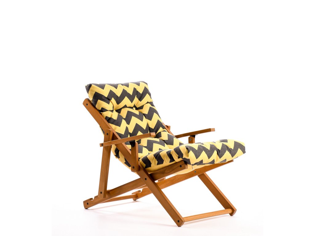 Praktické dřevěné lehátko REPOSE s žluto-černým polštářem zaujme svým designem i možností výškového nastavení.
