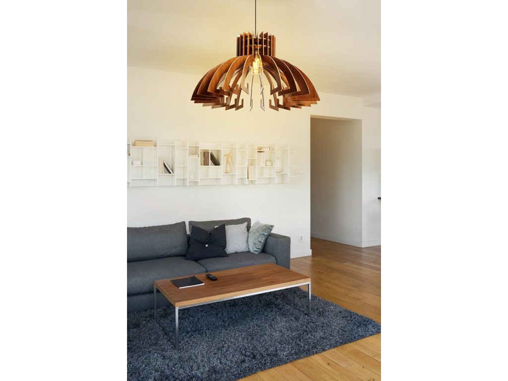 V dekoru ořech vyrobený lustr 165 vydává do stran tlumenější světlo, vrhá však o to zajímavější stíny.