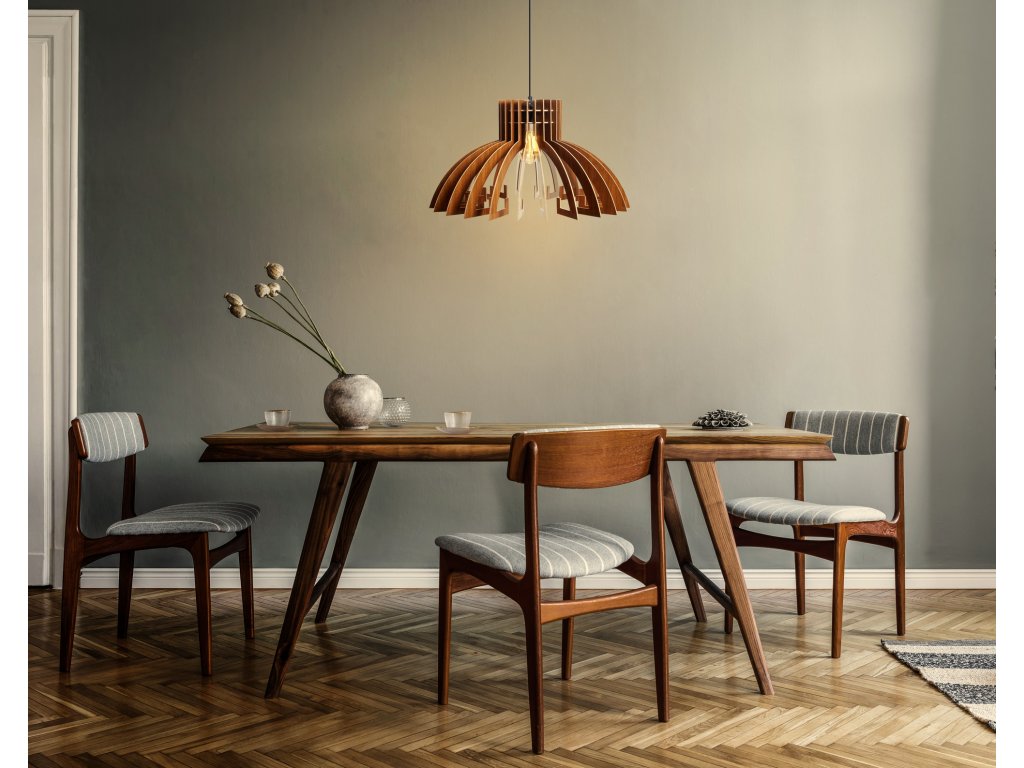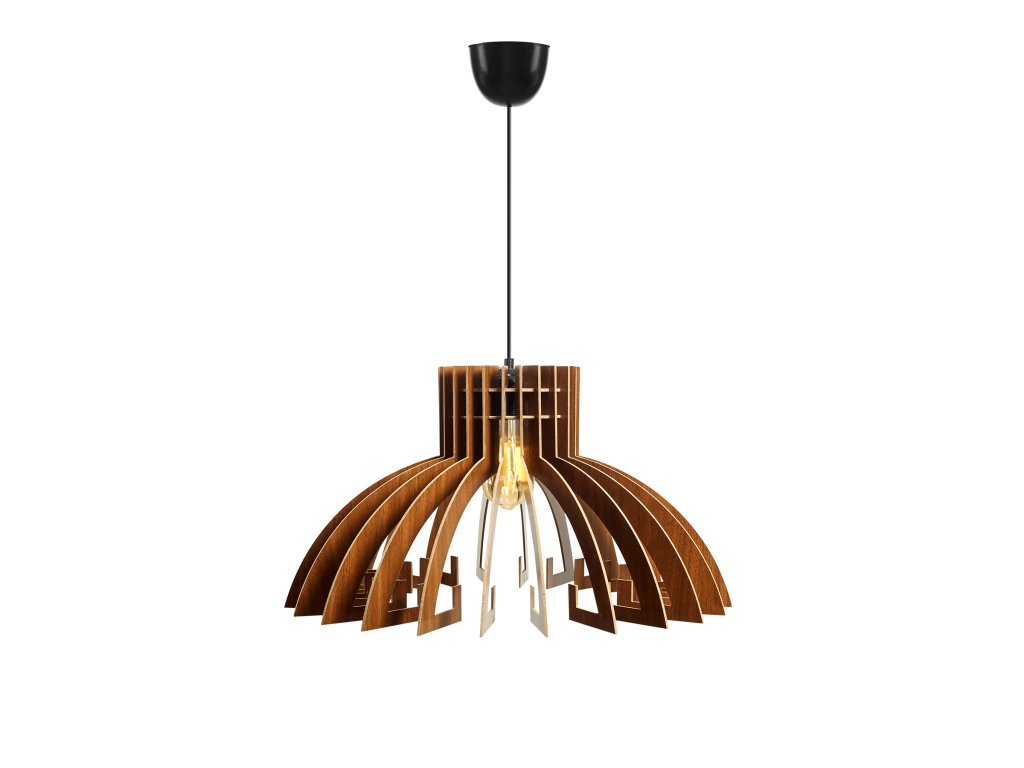 Tělo lustru je vyrobeno z kvalitních MDF malých desek v dekoru ořech nasázených v kruhu kolem objímky.