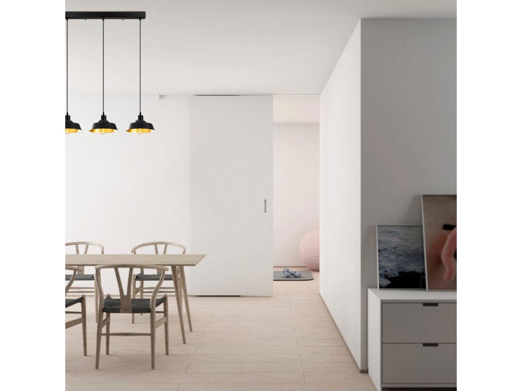 Černý lustr BERCESTE je tvořen podlouhlou základnou, ze které visí tři elegantní stínítka, jejichž zlatý vnitřek umocňuje efekt teplého světla.