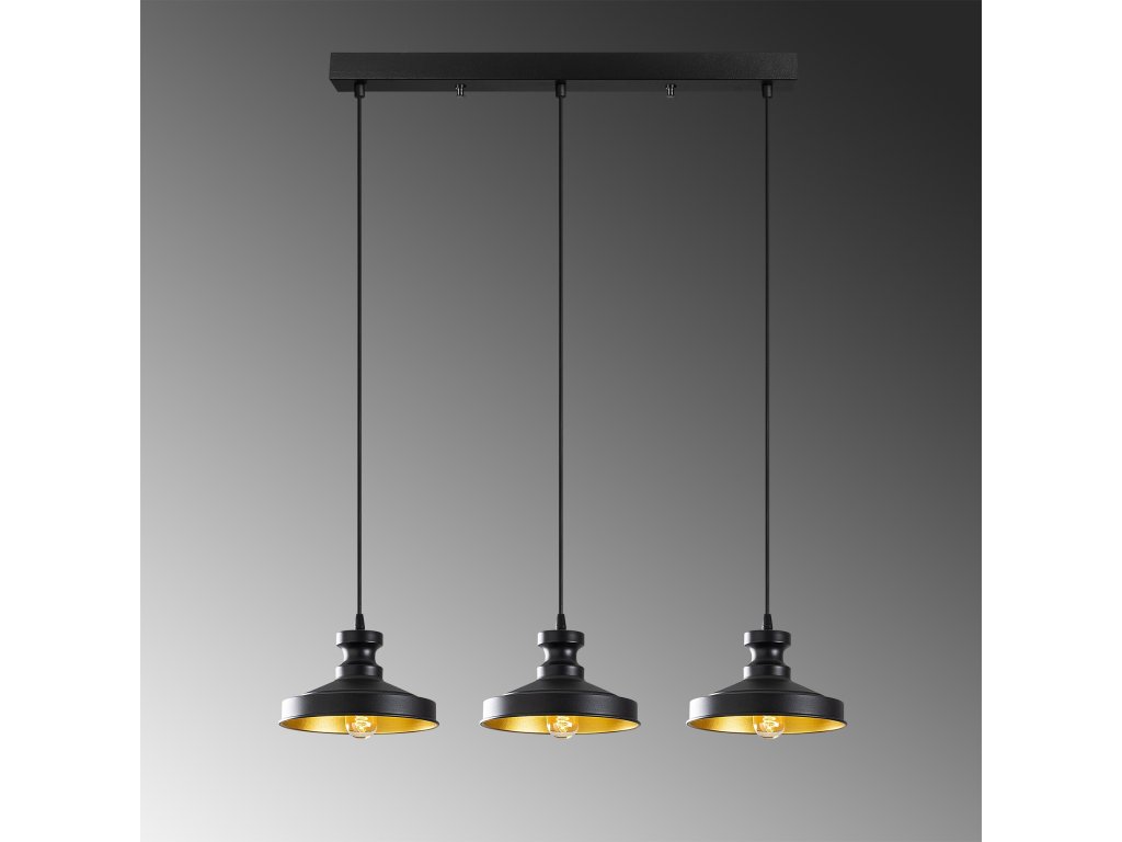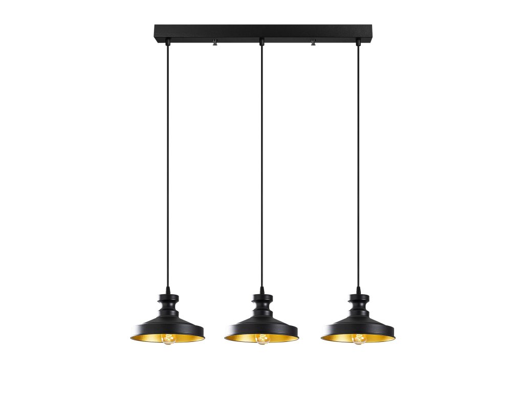 Černý lustr BERCESTE má tři drobná stínítka v industriálním stylu, jejichž vnitřek je ve zlaté barvě, což propůjčuje světlu měkce žluté tóny.