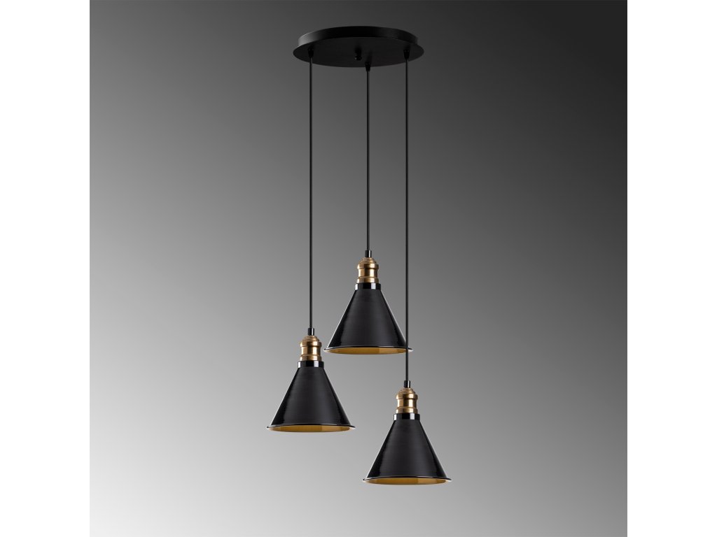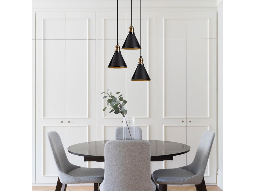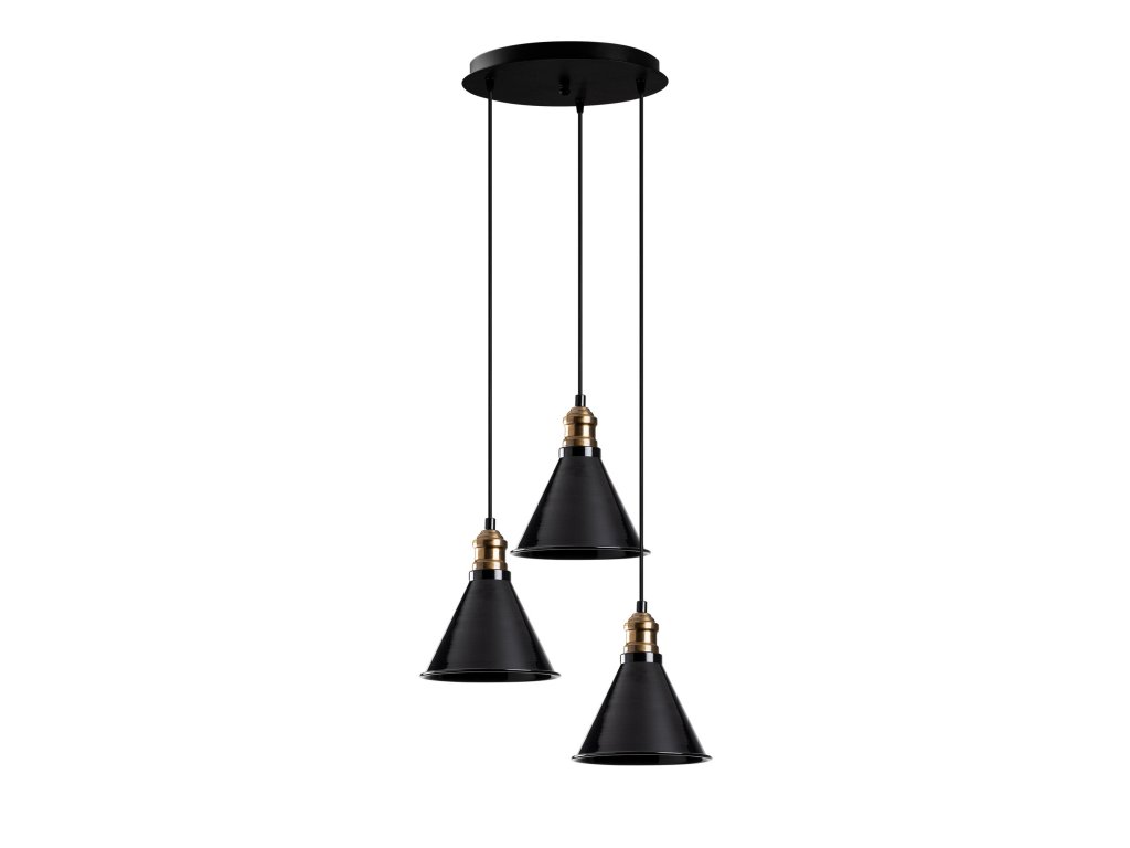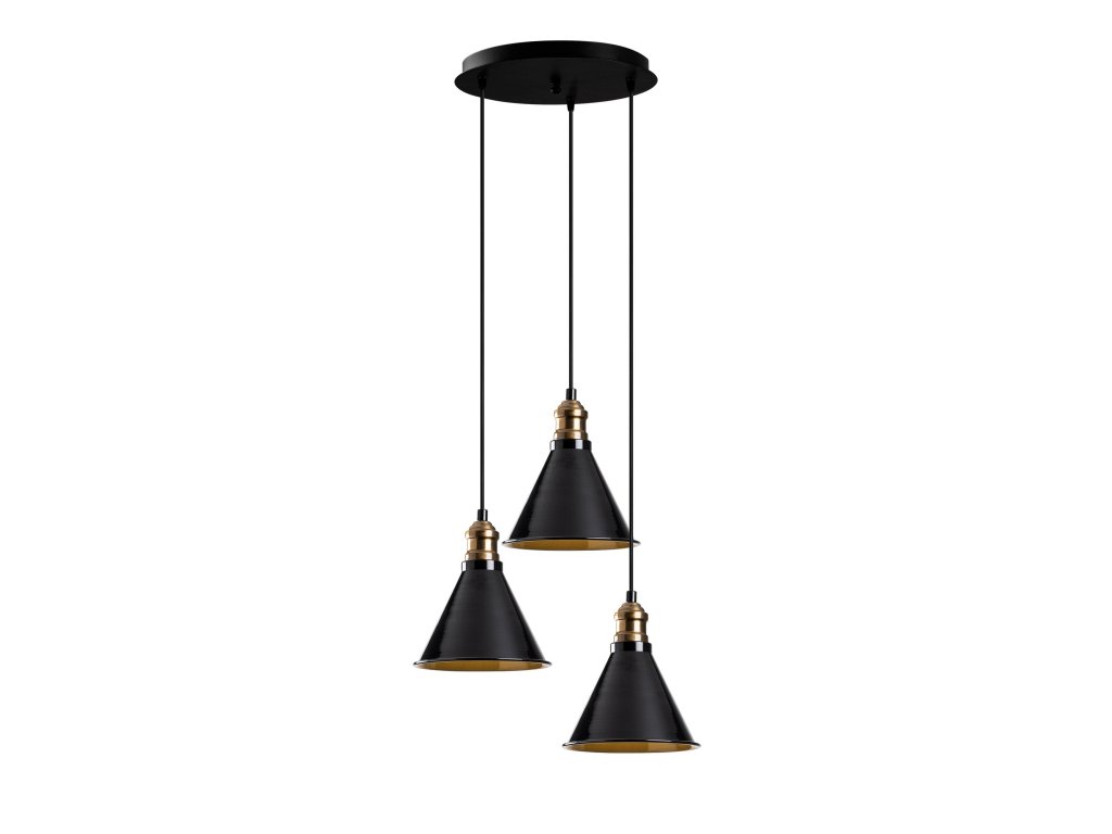 Černý lustr BERCESTE má tři drobná stínítka v industriálním stylu, jejichž vnitřek je ve zlaté barvě, což propůjčuje světlu měkce žluté tóny.