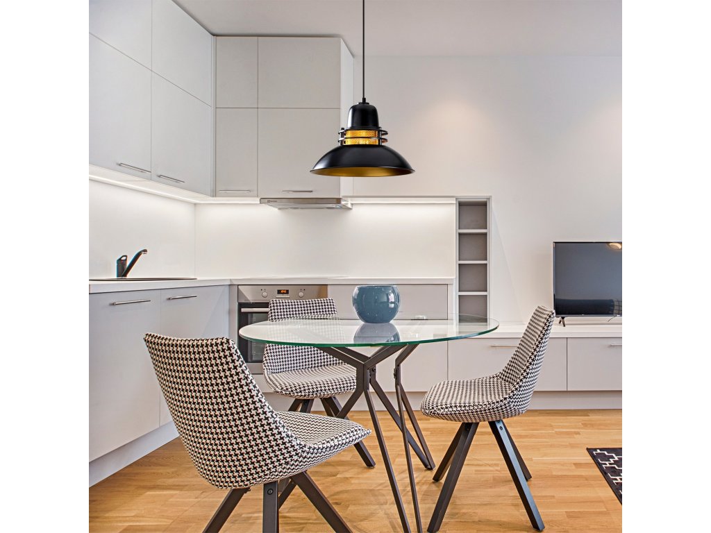 Kovový lustr evokuje industriální styl, je však příjemně zjemněn zlatou barvou vně stínítka i v podobě prstenců na stínítku.