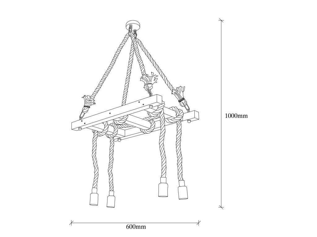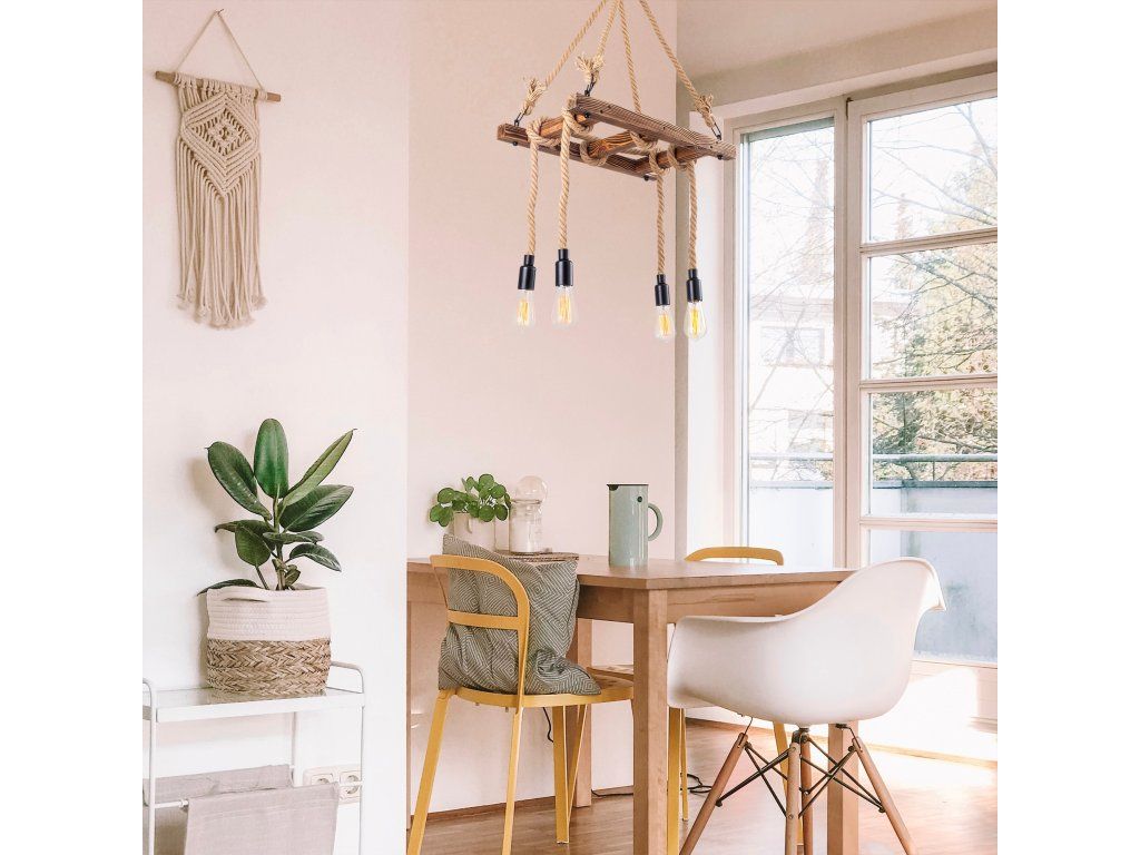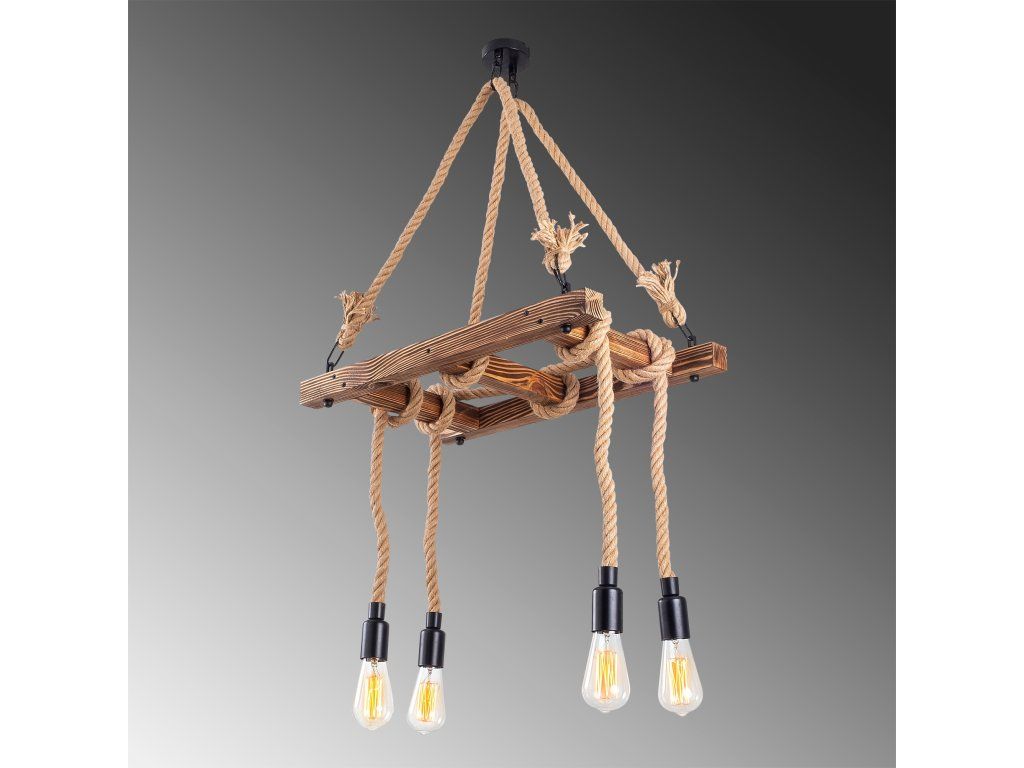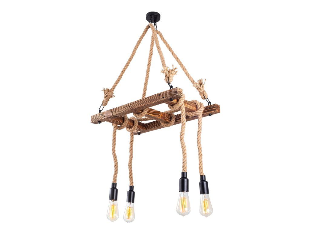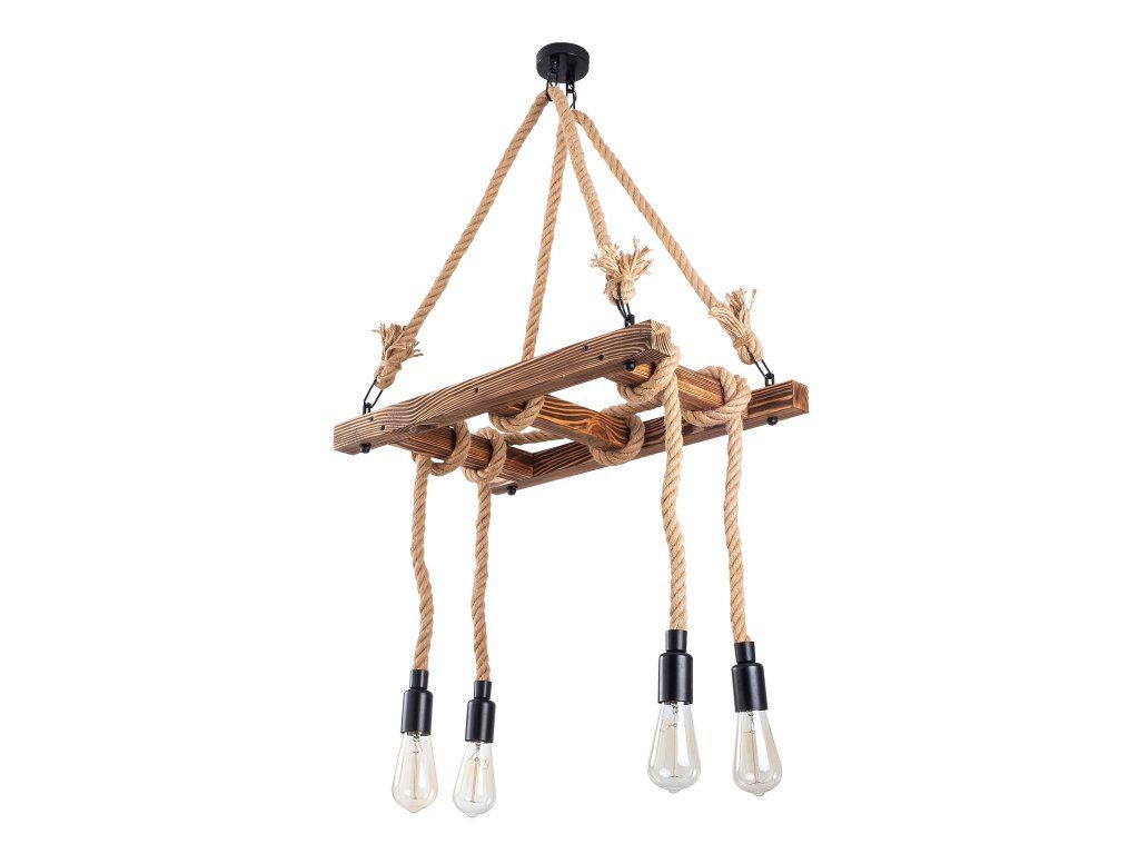 Na laně visící dřevěný maličký žebřík lustru EREBOS má na sobě namotaná další lana s objímkami bez stínítek.