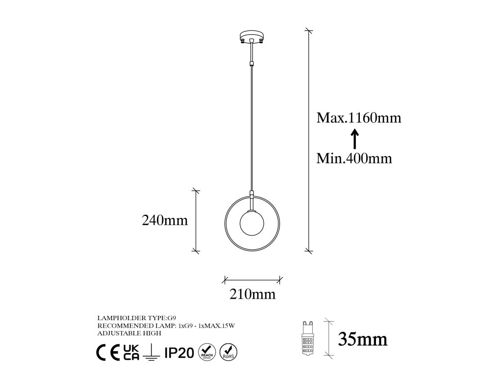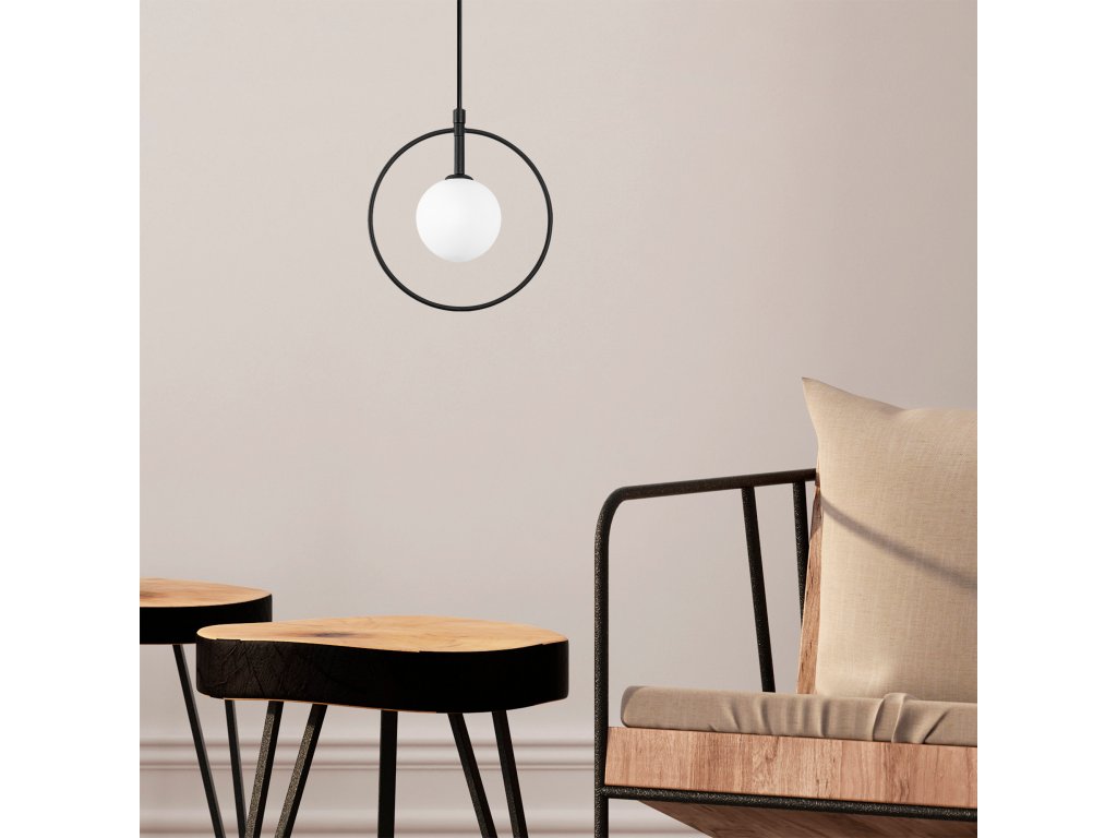 Lustr GEOMETRI 90 je vyroben z černé drobné základny, kabelu a kovového černého kruhového a kulatého bílého skleněného stínítka.