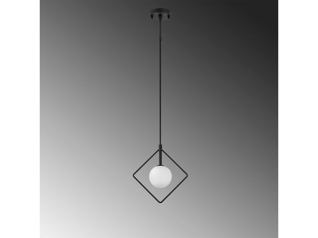 Lustr GEOMETRI 95 je vyroben z černé drobné základny, kabelu a dvojitého černého čtvercového a kulatého bílého skleněného stínítka.