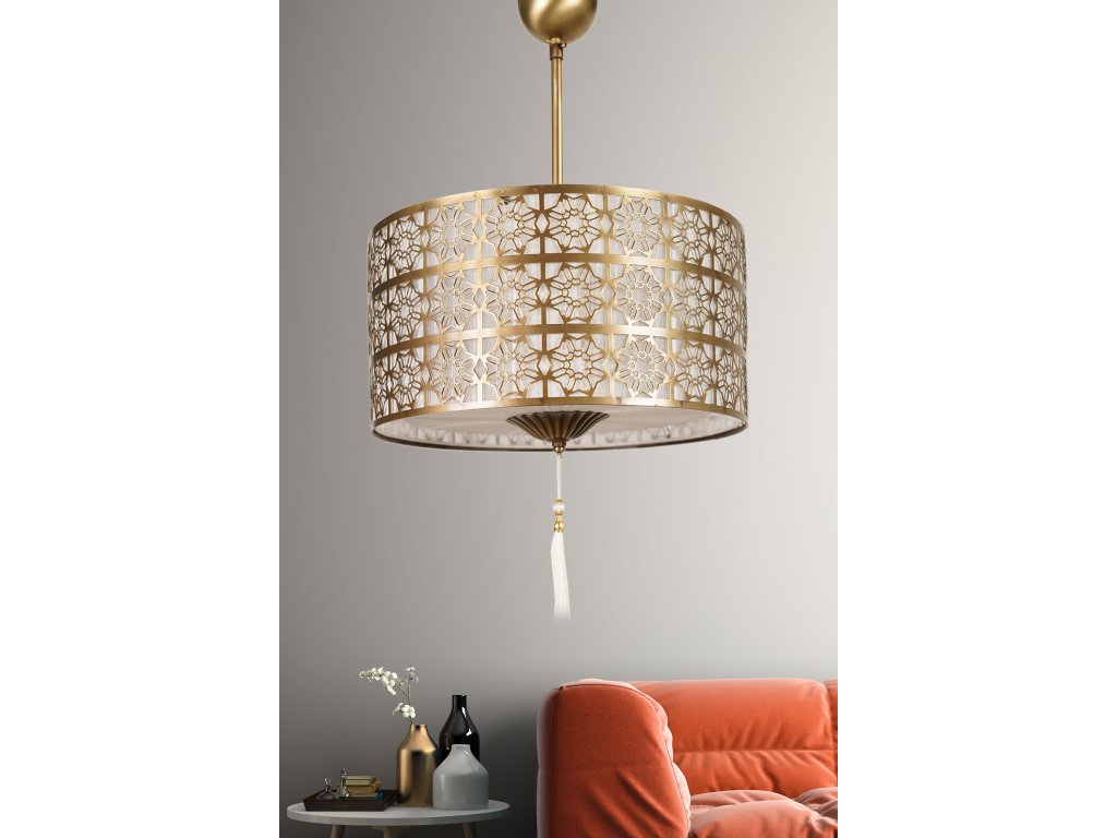 Doménou lustru HM268 je velké zdobené s bílým podkladem vyložené zlaté stínítko, které upoutává pozornost svým ozdobným perforováním s květy a zespodu drobným bílým střapcem, který lustr ještě opticky prodlužuje.