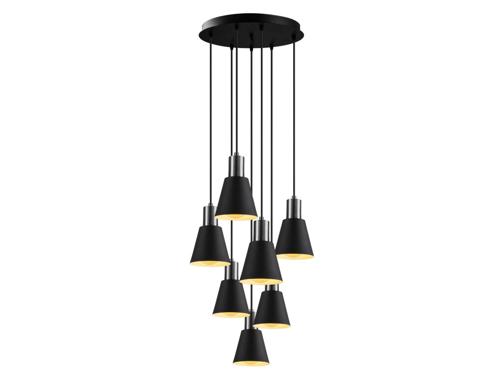 Lustr KEM je černá robustní sestava sedmi stínítek visících z kruhové základny.