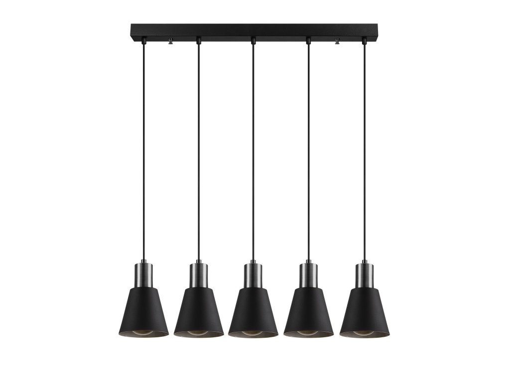 Černý lustr KEM s niklovými objímkami je vhodnou osvětlovací soustavou nad velký stůl, nebo do velkých prostorných pokojů.