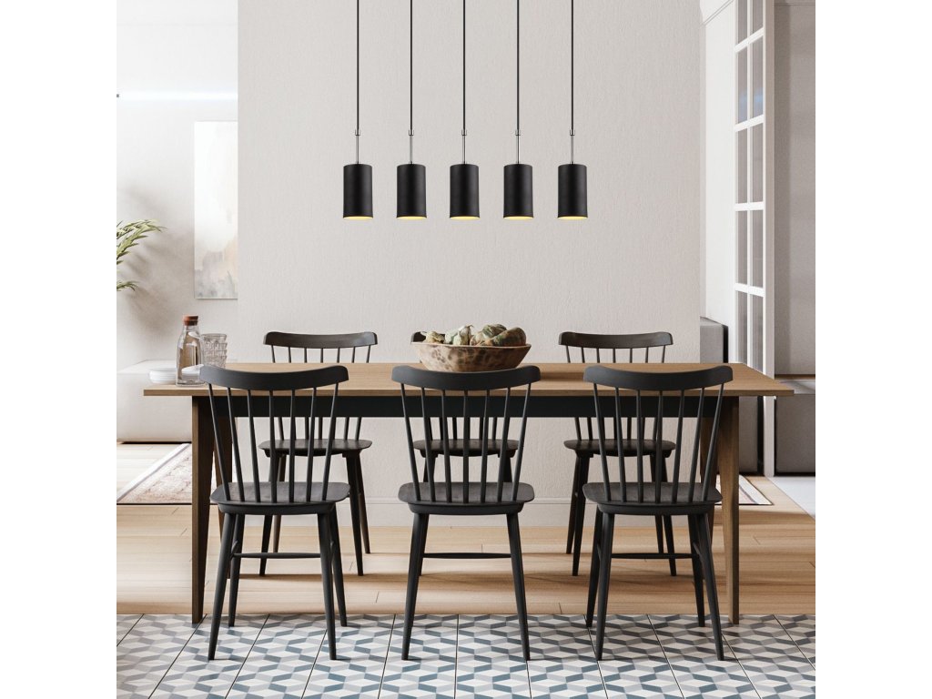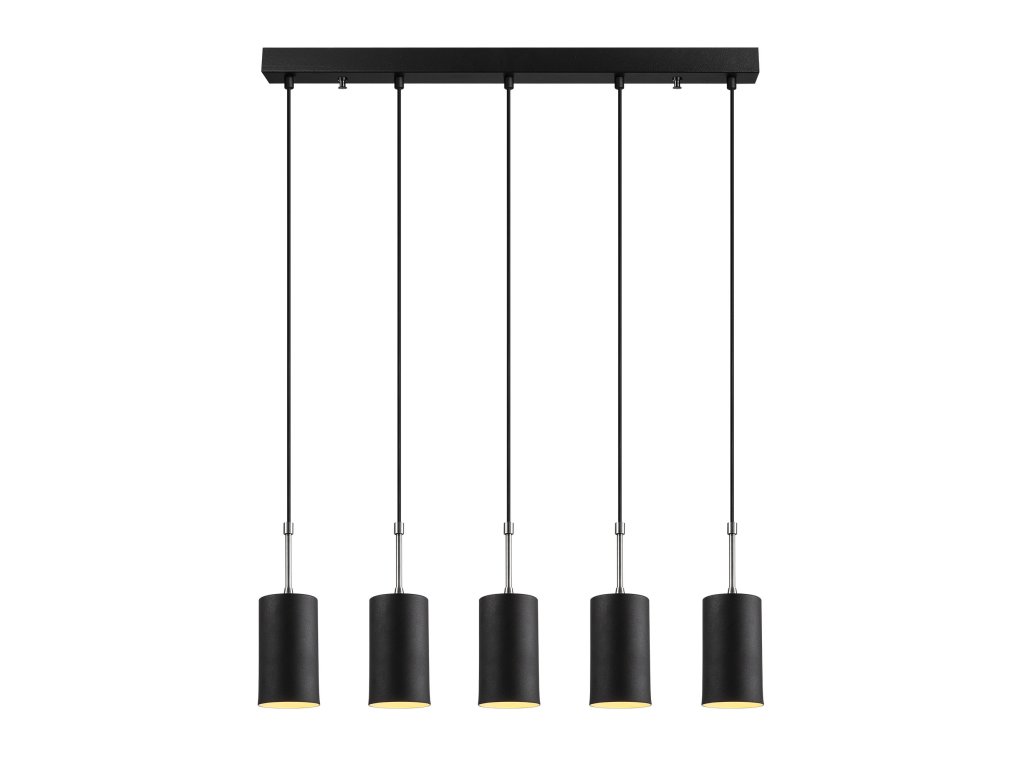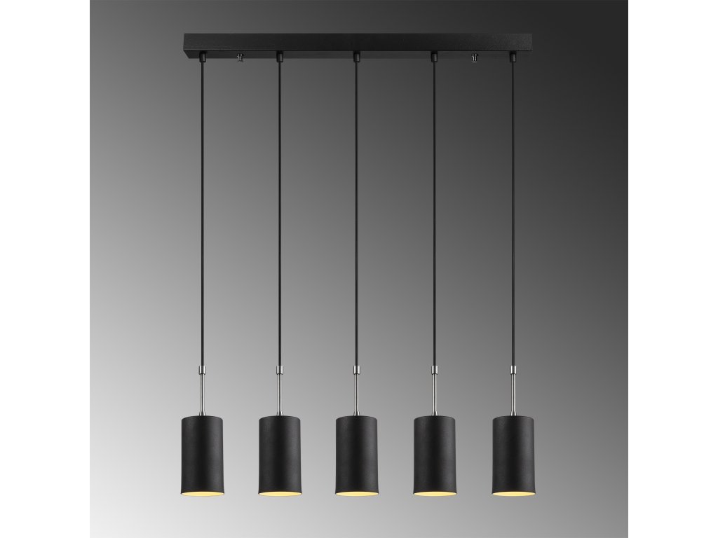 Dlouhý černý lustr s pěti válečkovými stínítky. které usměrňují světlo do úzkých paprsků, poskytuje decentní osvícení místnosti.