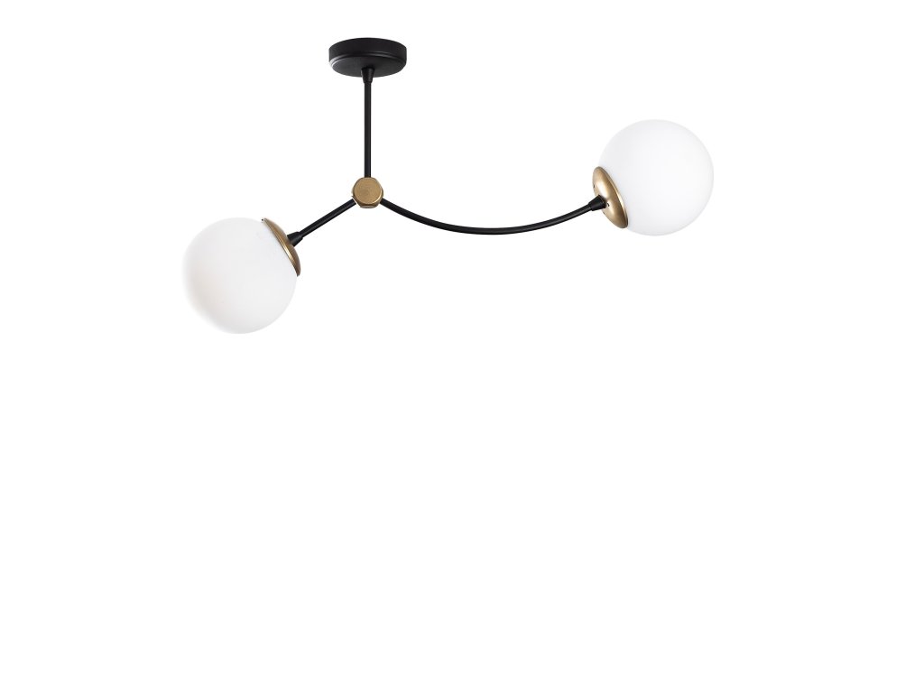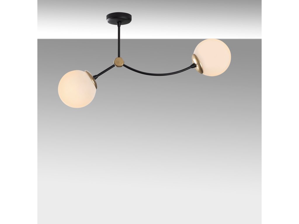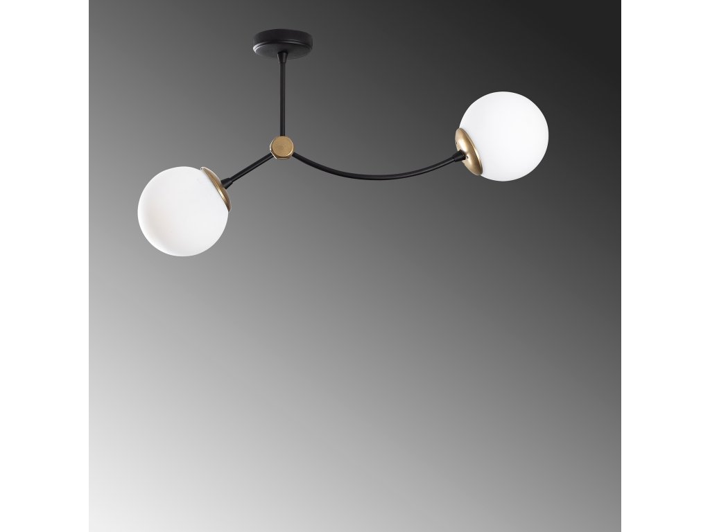 Ramena lustru KROMOZOM jsou oblá a na jejich koncích jsou jako velké sněhové koule upevněná dvě bílá stínítka.