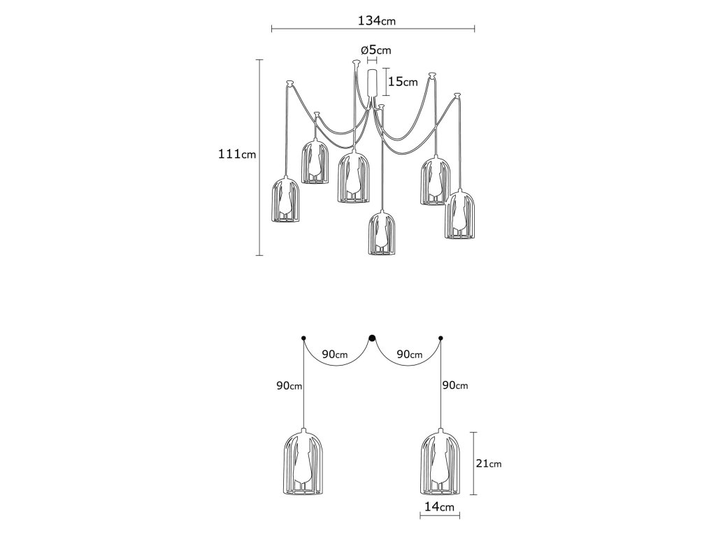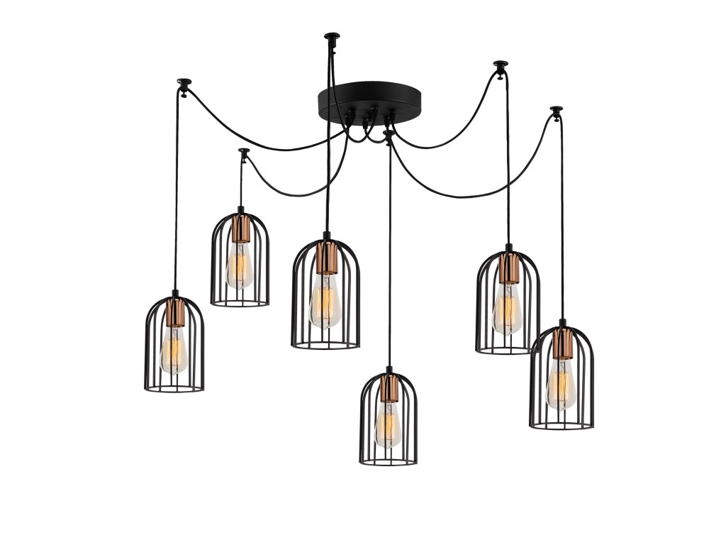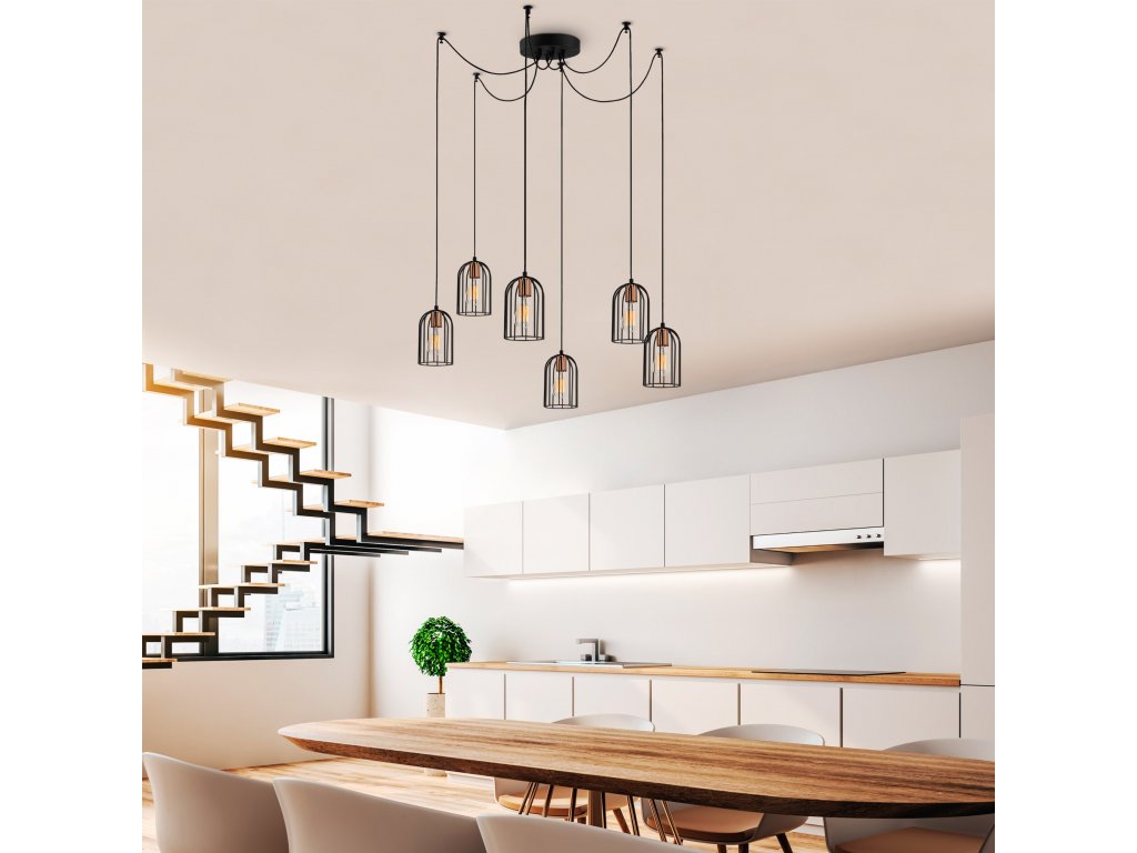 PAMUKKALE je lustr tvořen černým tělem a šesti stínítky z kovových drátů, které visí na výškově nastavitelných kabelech.