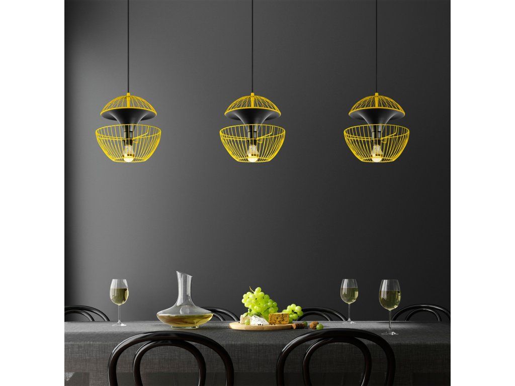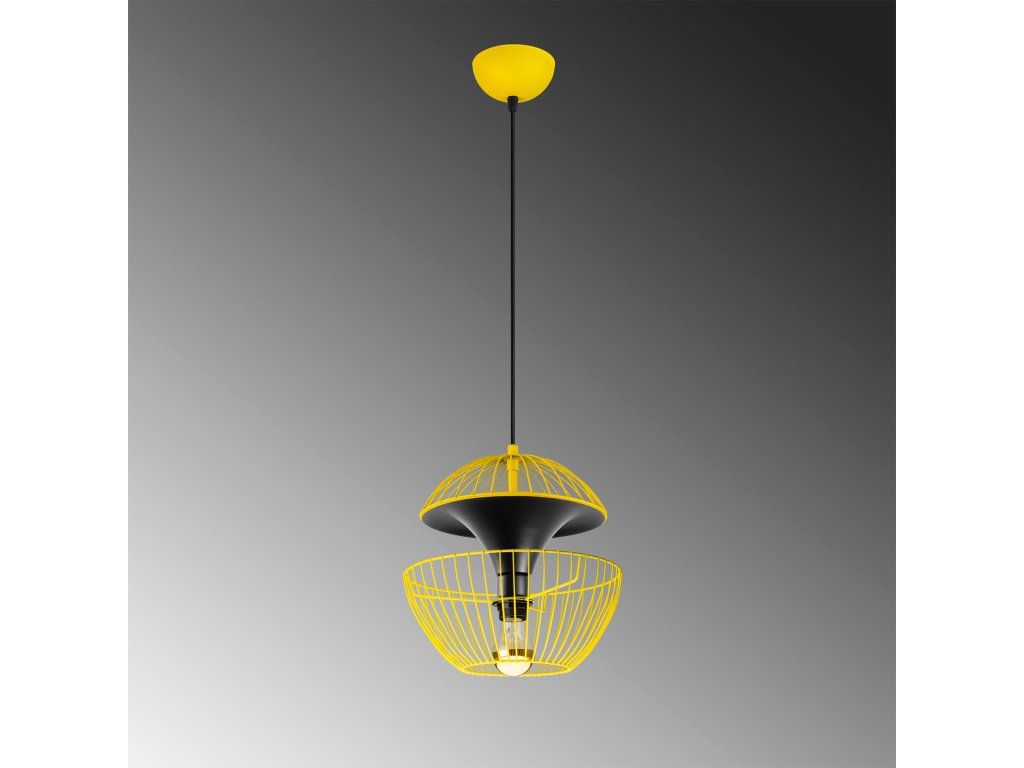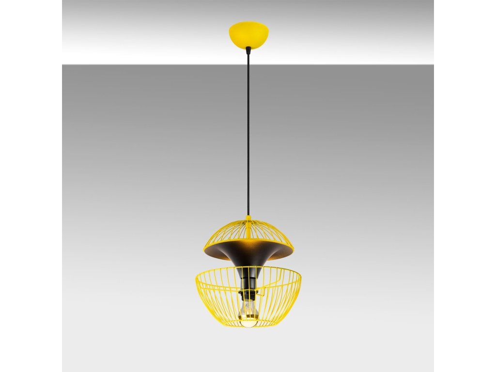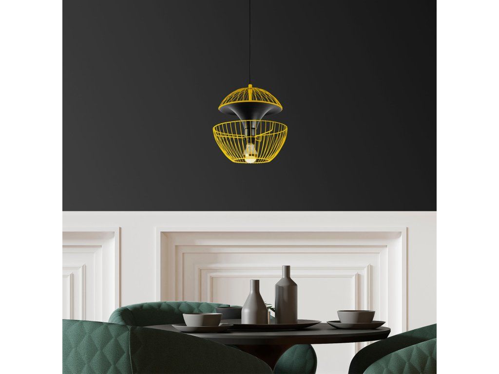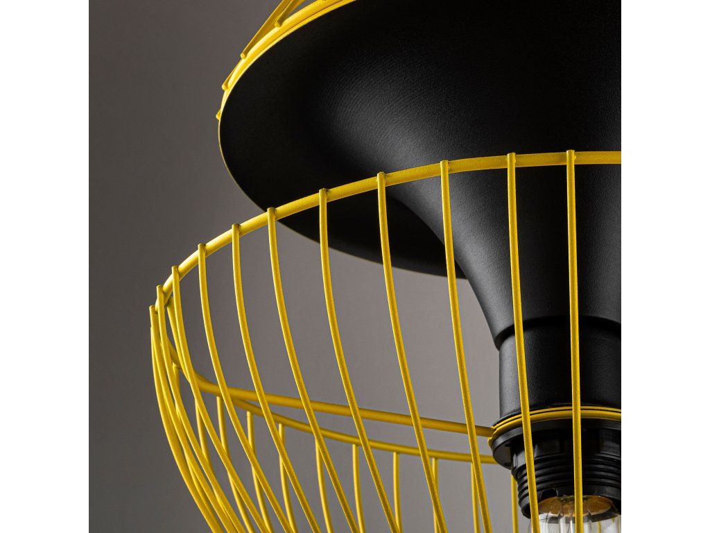 Žluto-černý lustr TELMANDER je složený z drobné kruhové základny, výškově nastavitelného drátěného členitého stínítka.