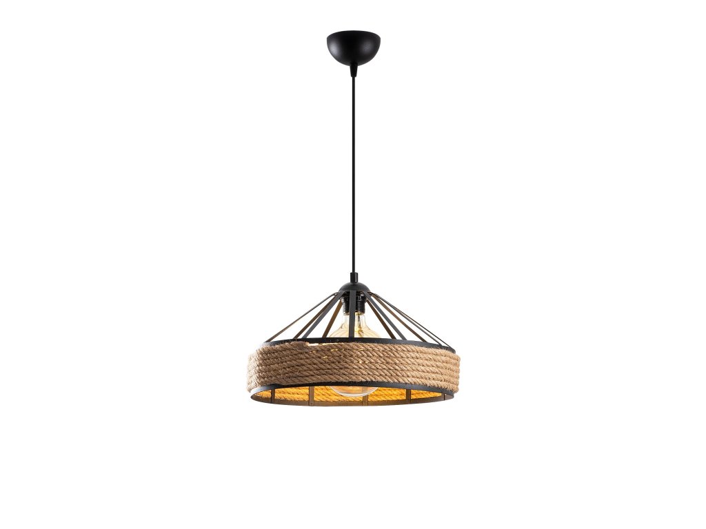 Lustr WIRE má poměrně robustnou černou konstrukci, která je vyplétaná přírodním motouzem a dotváří tak vzhled kola starého auta.